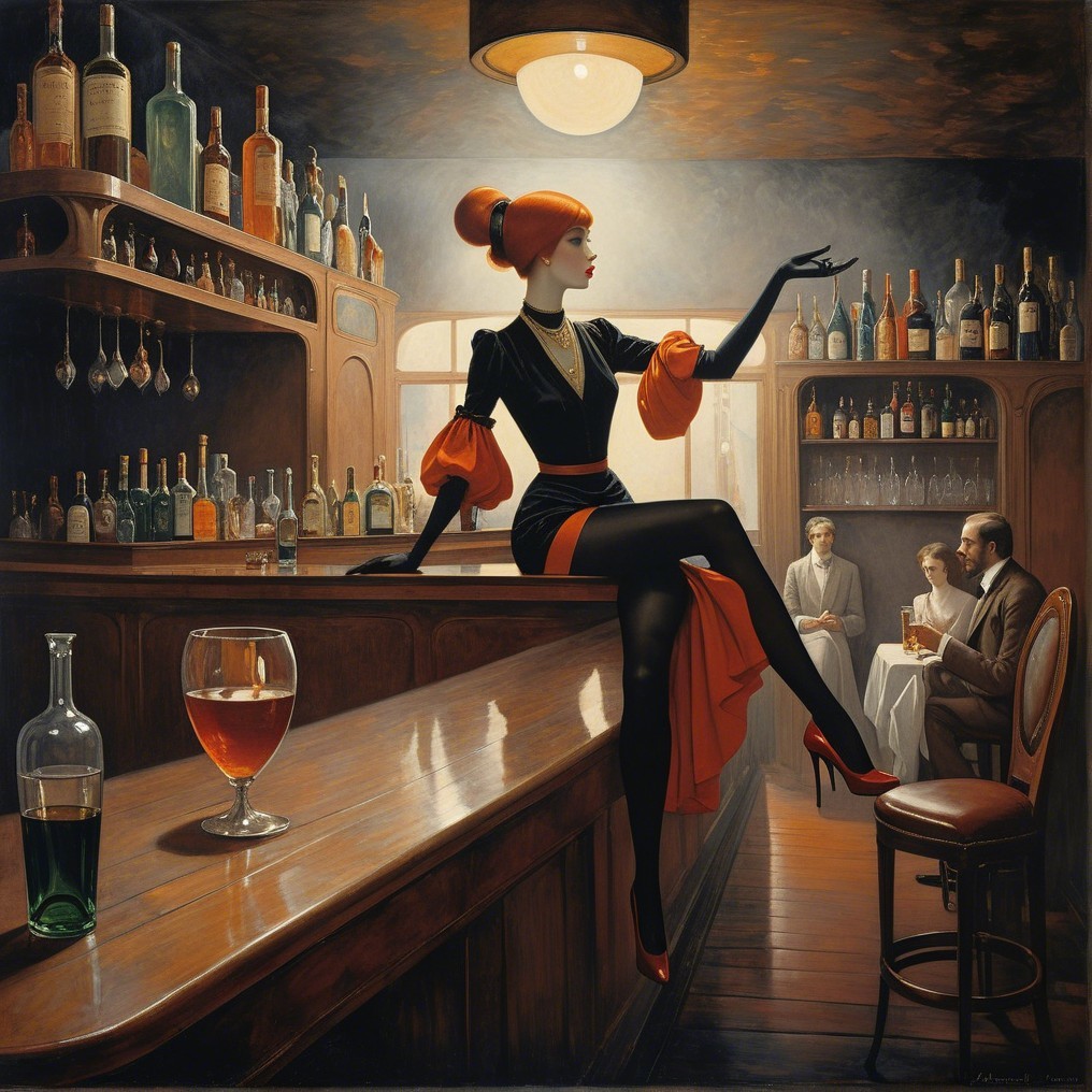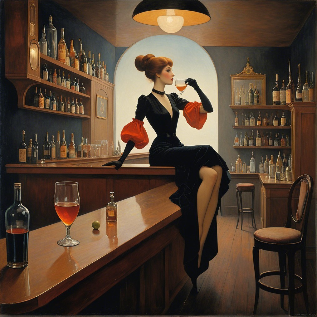 A stylish woman in a sleek black dress sits gracefully on a bar, sipping a cocktail. The warm, inviting space features vintage paintings and elegant lighting, creating a sophisticated atmosphere.