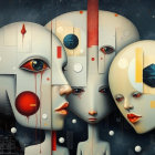 The artwork features abstract humanoid figures with oversized heads, expressive eyes, and surreal elements like planets and geometric shapes, creating an eerie yet captivating atmosphere.