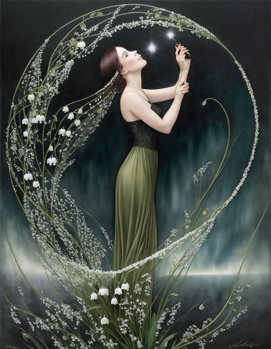 A woman in a green dress stands before a large moon, holding and smelling a bouquet of white flowers, amid a floral vine ambiance.