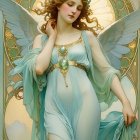 A beautifully adorned woman in a flowing turquoise outfit, embellished with gold and jewels. She exudes grace, set against an intricate background with a radiant halo and delicate floral patterns.