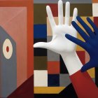 The artwork features two stylized hands—one white and one dark blue—against a geometric background of warm and cool colors, creating a striking contrast between the figures and their surroundings.