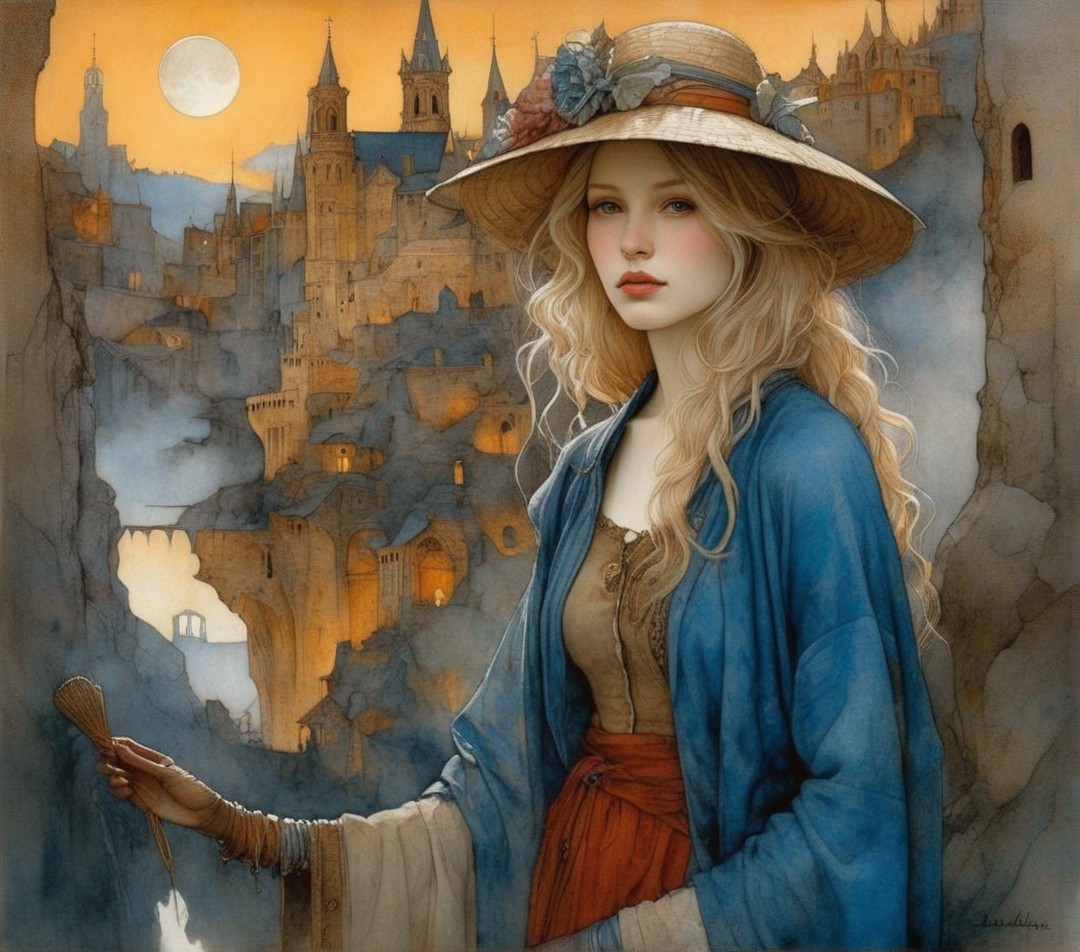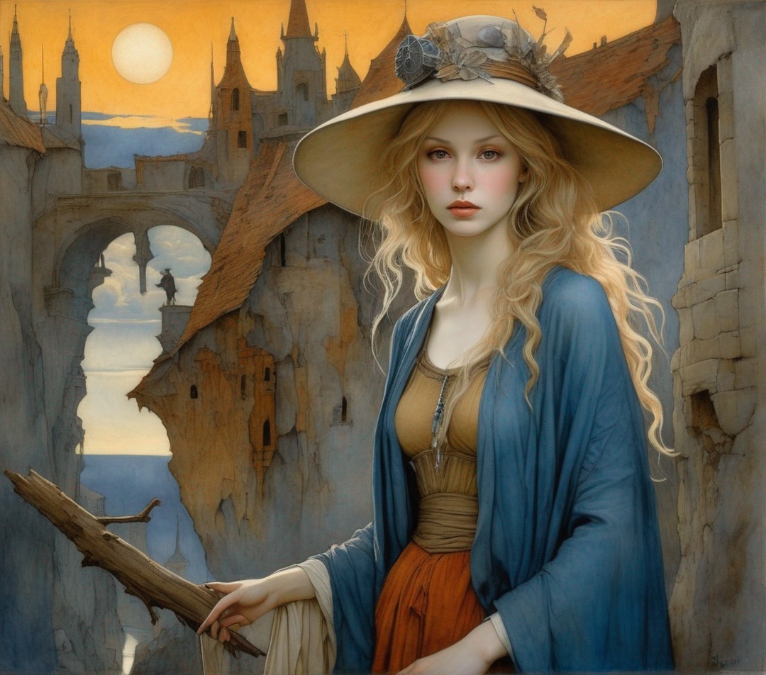 A painting of a woman in a wide-brimmed hat with an owl on her arm against a backdrop of gothic cathedrals under an orange sky.