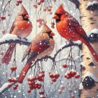 Three vibrant cardinals perch on a snow-covered branch, surrounded by red berries and a snowy backdrop. Their striking red plumage contrasts beautifully with the winter landscape.
