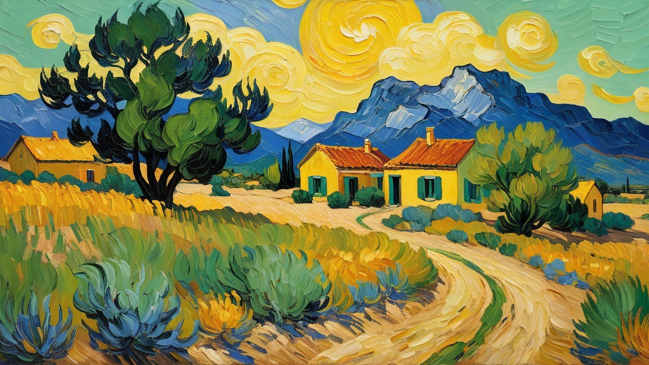 A vibrant oil painting depicting a countryside landscape in the style of Van Gogh, featuring bold, impasto brushstrokes and intense colors. A bright yellow house with a reddish-brown roof and green shutters stands prominently in the center-right, nestled amidst a field of golden-yellow crops, possibly wheat,