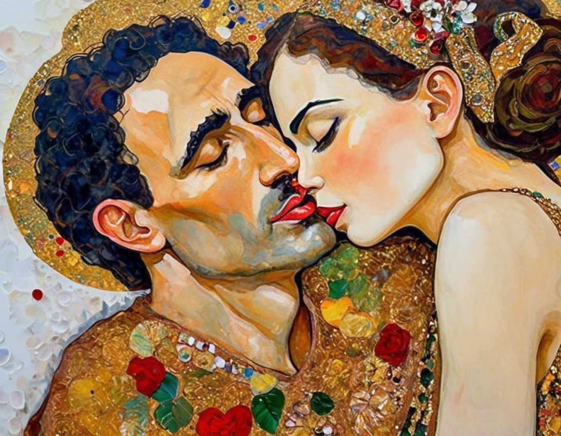An artwork depicting a close-up of a man and woman about to kiss, with vibrant, multicolored, and patterned details.