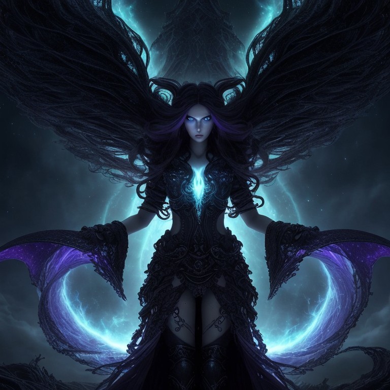 A mystical figure with flowing hair and glowing purple eyes stands amidst a starry backdrop, radiating magical energy from spiral motifs.