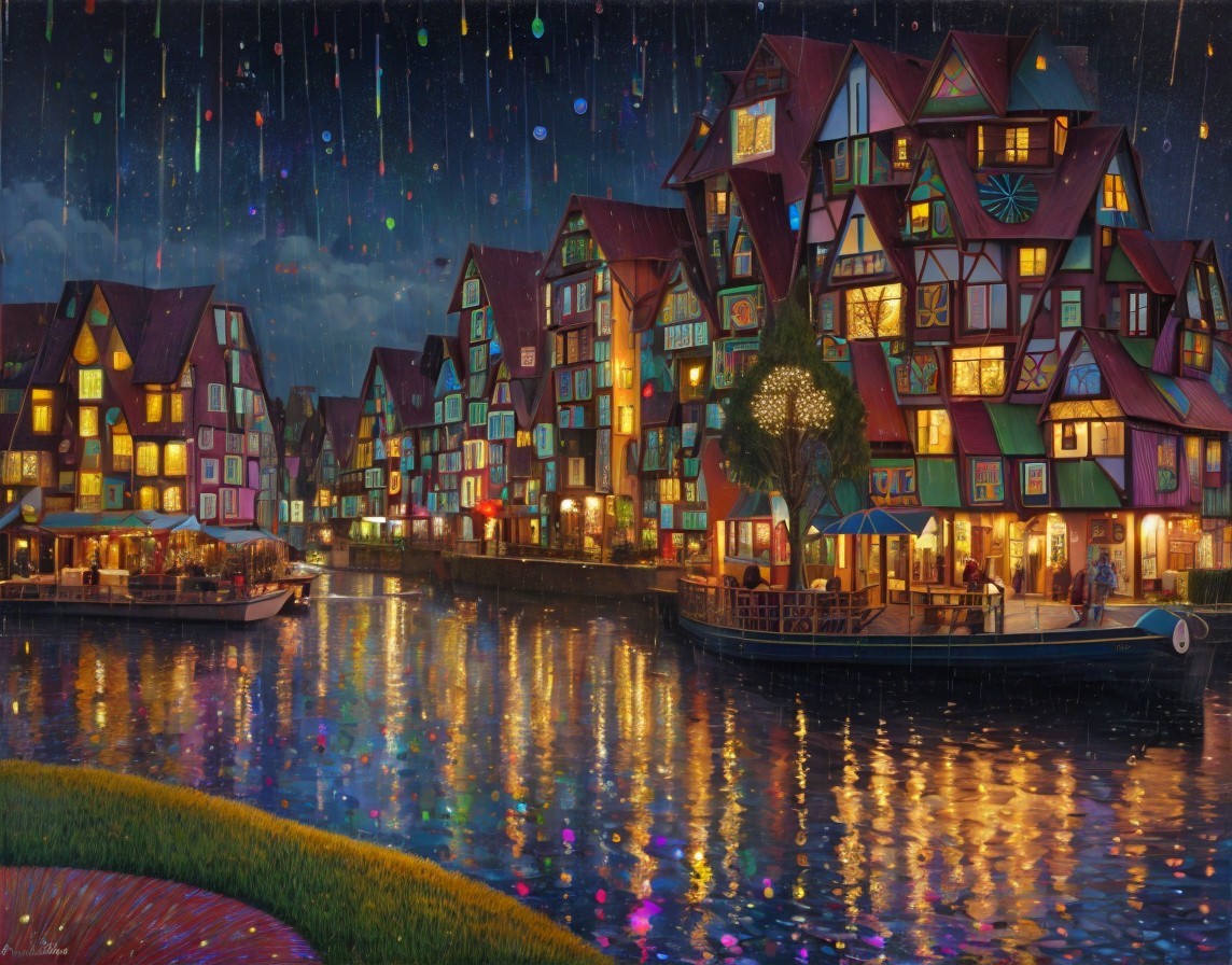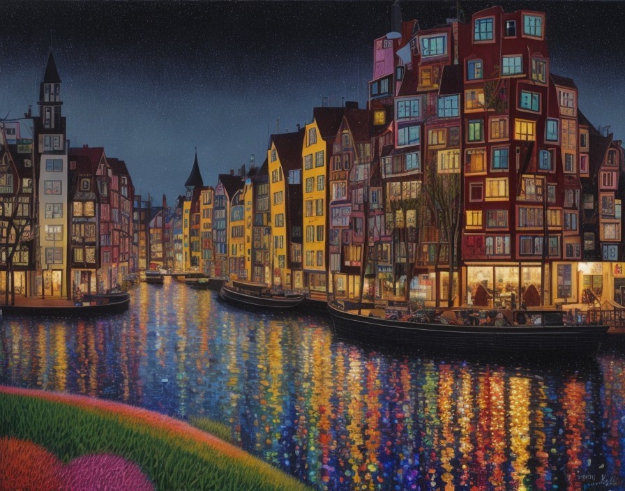 A vibrant, starry night over a quaint canal-side street lined with colorful, illuminated buildings and pedestrians.