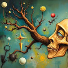 The artwork depicts a surreal scene featuring a large skull entwined with a gnarled tree. Celestial bodies and abstract forms float around, creating a dreamlike atmosphere that intertwines nature and mortality.