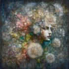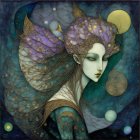 A mystical figure with butterfly wings adorned with blue and purple hues stands against a night sky, featuring two glowing moons. Her elegant attire and floral crown enhance the enchanting scene.