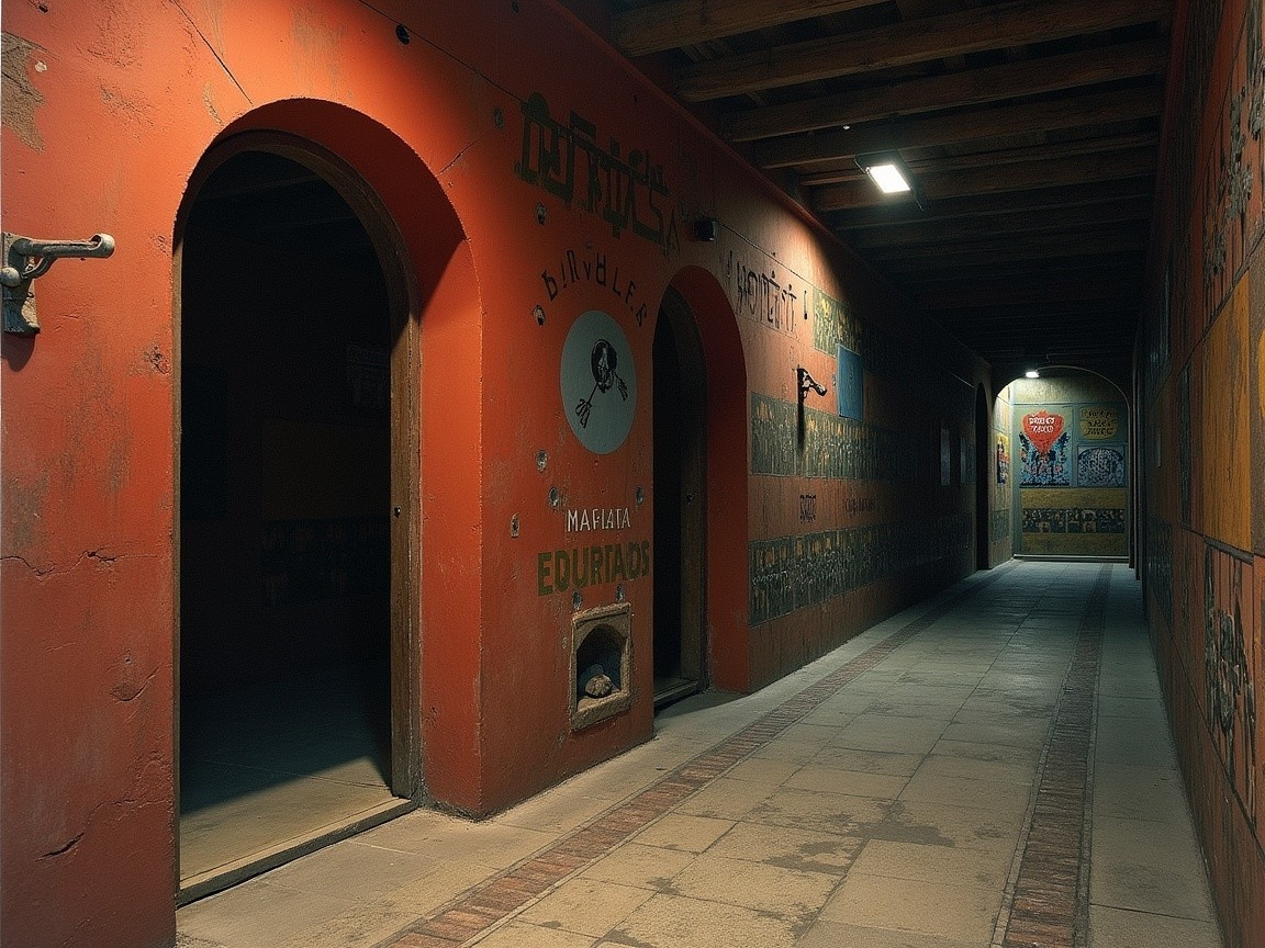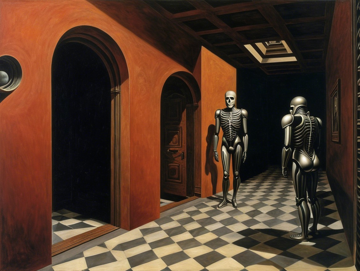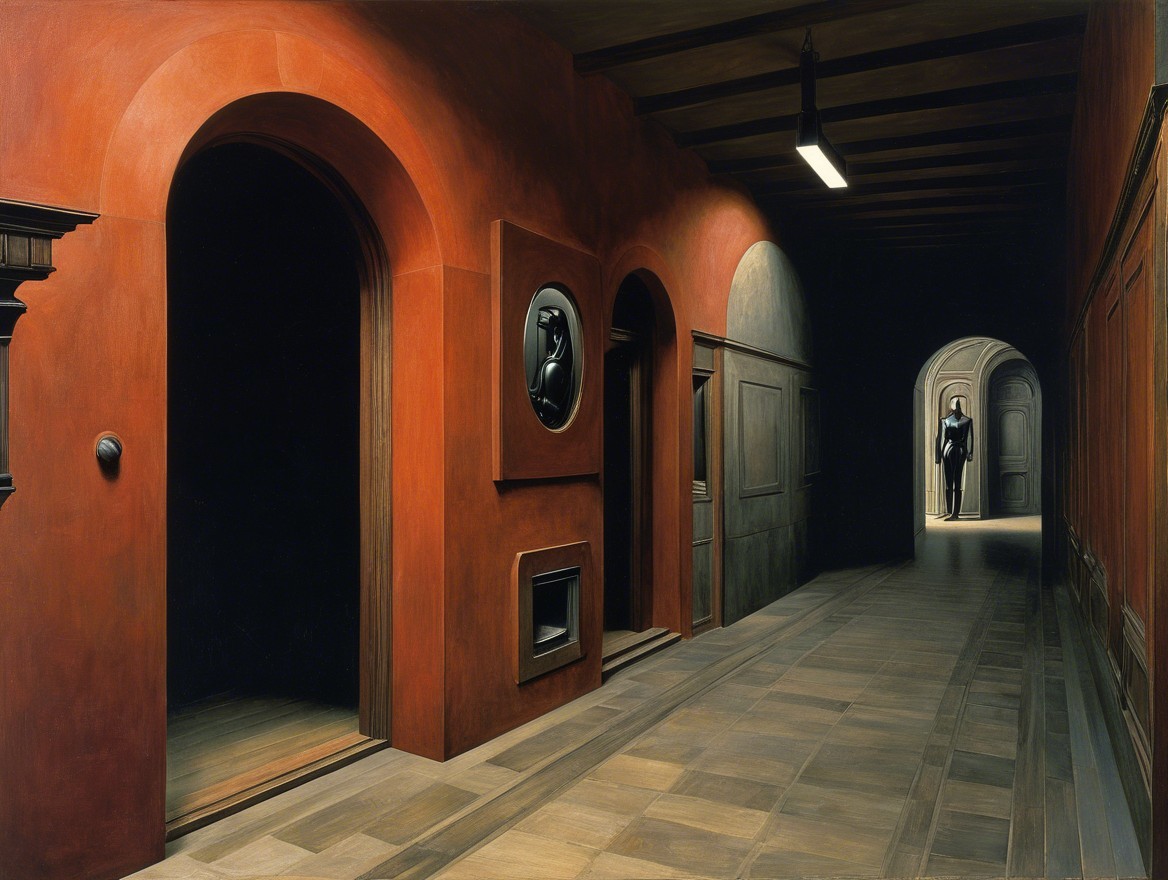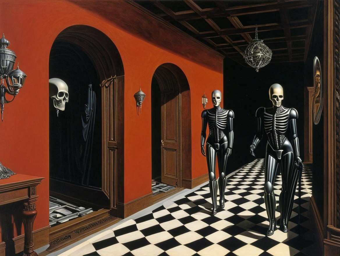 This surreal hallway features bold red walls and a geometric black-and-white checkered floor. Sculptures and eerie reflections enhance the mysterious, dreamlike atmosphere.