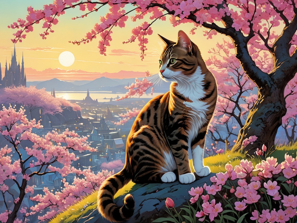 A serene landscape features a striped cat perched on a rock amidst blooming cherry blossom trees. The sun sets over distant mountains, casting a warm glow on the tranquil scene.