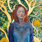A woman with wavy red hair stands against a vibrant backdrop of intertwining trees and leaves, wearing a blue dress adorned with floral patterns, evoking a sense of nature and tranquility.