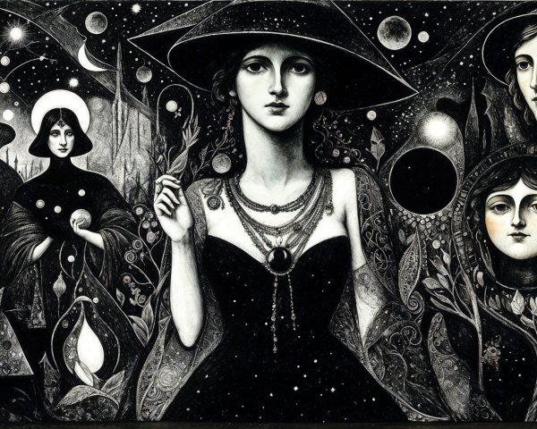 The artwork features two women in vibrant, stained glass-like dresses, set against a surreal landscape of mountains and a colorful sunset, blending elements of nature and art in harmony.