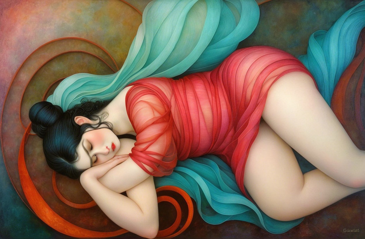 A serene figure with flowing, colorful hair lies peacefully, draped in a vibrant red and orange garment. The background features a dreamy, cosmic swirl, enhancing her tranquil pose. Original prompt by CKOj