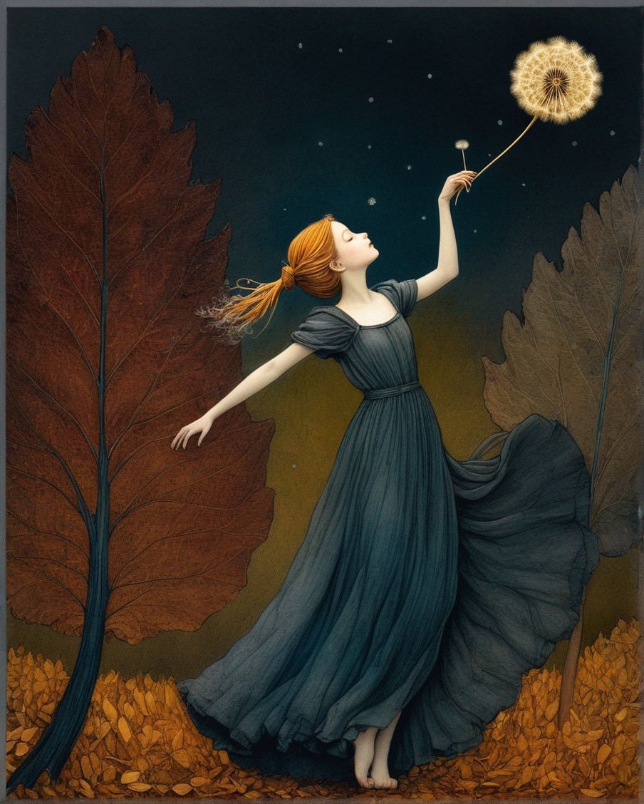A fairy in a flowing dress blows on a dandelion, surrounded by a dark, autumnal backdrop with whimsical details.