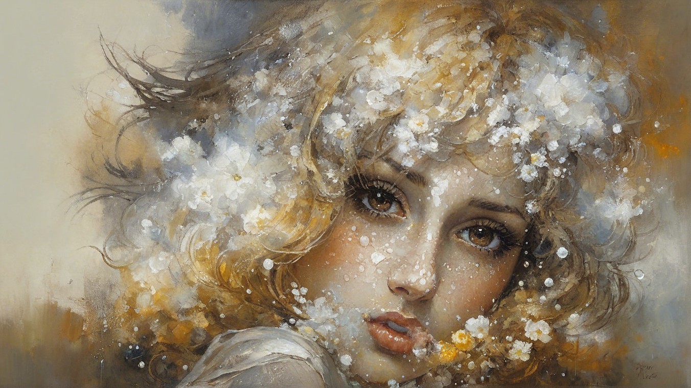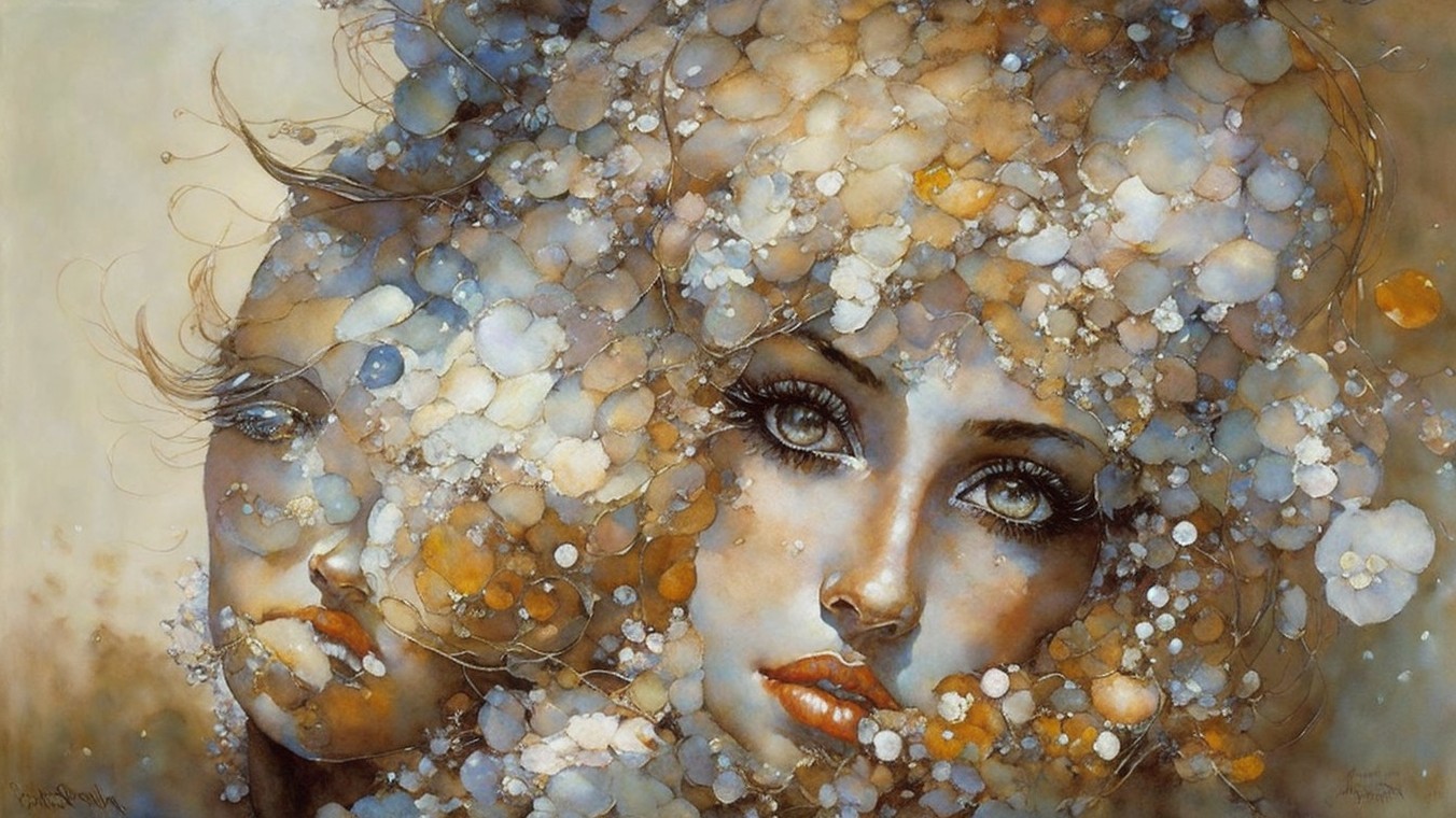 "Now that she's back in the atmosphere, with drops of Jupiter in her hair, she acts like summer and walks like rain" Beautiful exotic woman. Arthur Rackham Paul Klee Norman Rockwell anatomically correct Steve Hanks muted tones symmetrical face Ochre Big brown eyes Subdued palette wide open dark eyes Symmetrical eyes, nose and mouth moody, somber, desaturated colors Soft, somber, delicate Soft dappled lighting. Golden hour. Leonardo, Durer, Schiele, Degas, Mondrian - mixed media surreal Richard Burlet celestial Enki Bilal dynamic pose Esao Andrews enigmatic dreamy atmosphere susanne Jamie Heiden cosmic splendor Surreal dream In the darkness I dance