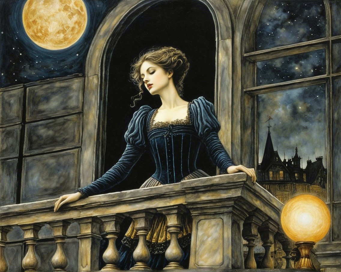 A woman in a golden gown leans gracefully on a balcony, gazing at a full moon and starry sky. A distant planet shines brightly, enhancing the mystical, serene atmosphere of the scene.