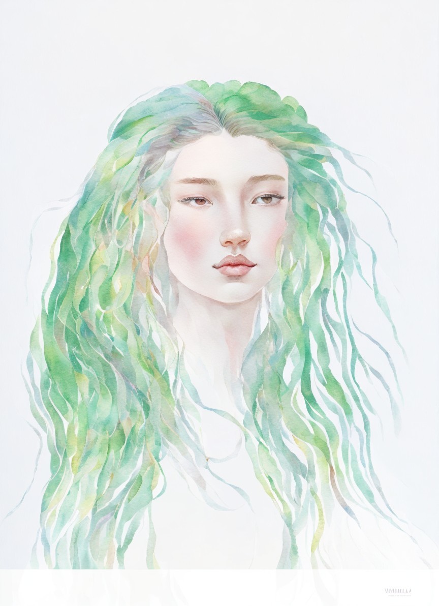 A serene young woman features long, pale hair adorned with greenery. Her gentle expression and soft attire create a peaceful, nature-inspired look against a light background.