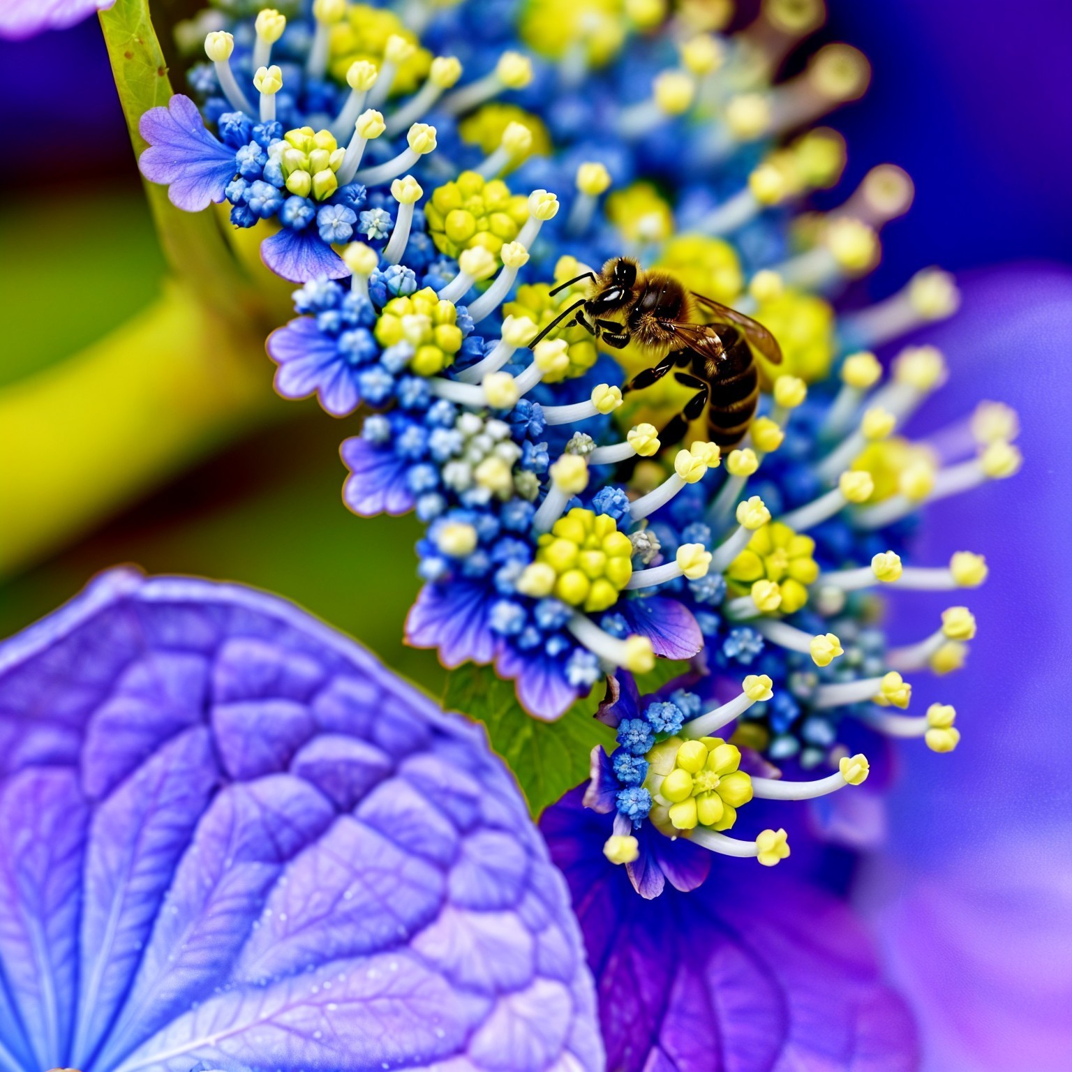 A honeybee busily gathers nectar from a cluster of vibrant blue hydrangea flowers, showcasing nature's beauty and the vital role of pollinators in the ecosystem.
