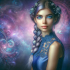 A young woman with long, wavy hair poses gracefully against a textured, abstract background featuring cracks and a blend of blue and purple hues, highlighting her delicate features.