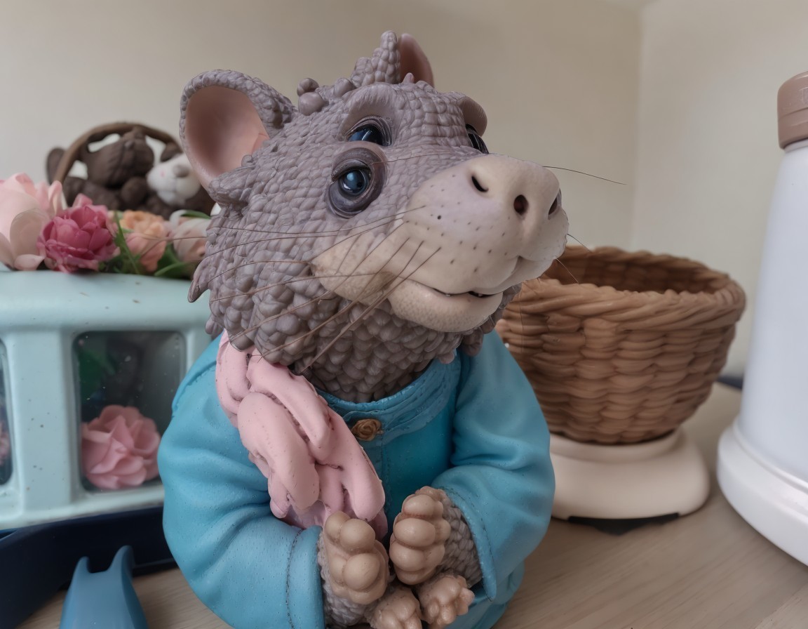 A cute figurine of an anthropomorphic mouse in a blue jacket and hat, surrounded by houseplants and teapot decor.