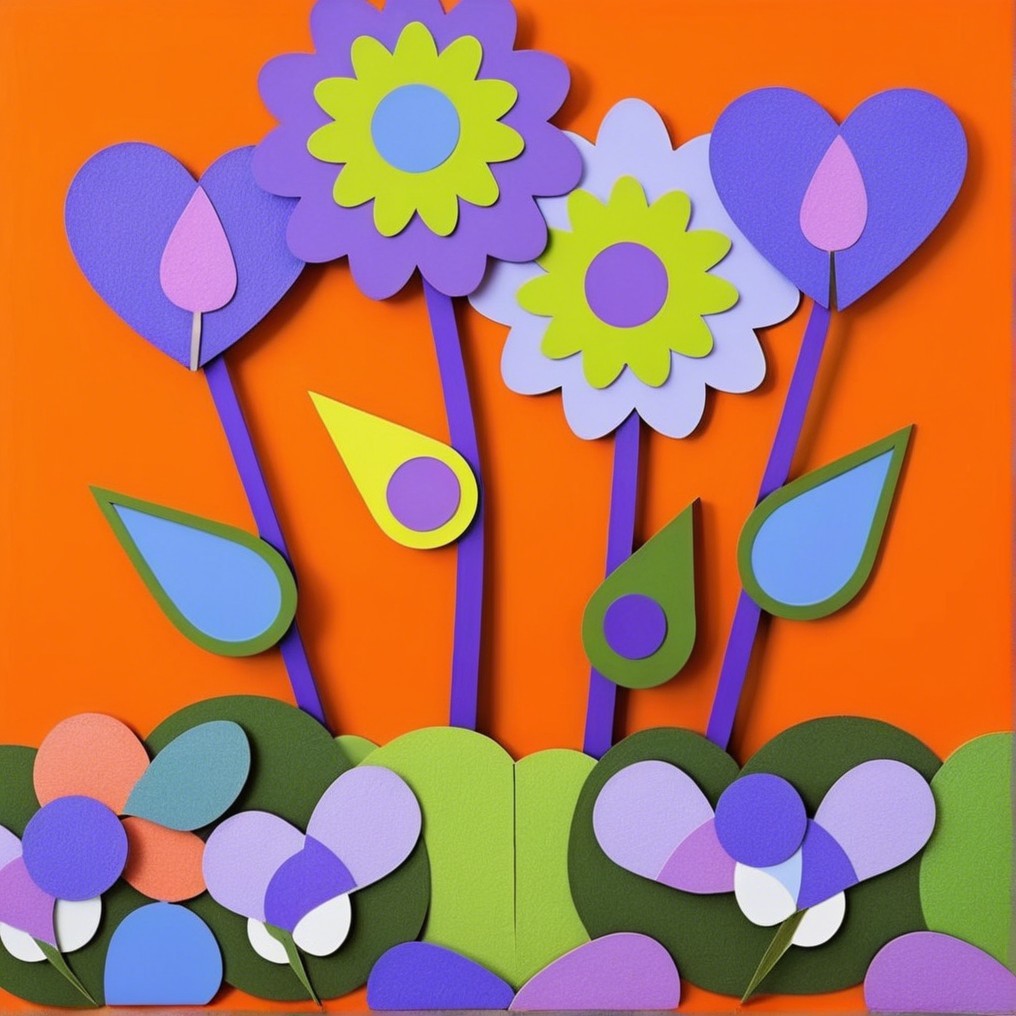 A vibrant, playful collage features colorful flowers with heart-shaped petals and teardrop leaves, set against a bright orange background, creating a cheerful, whimsical scene.