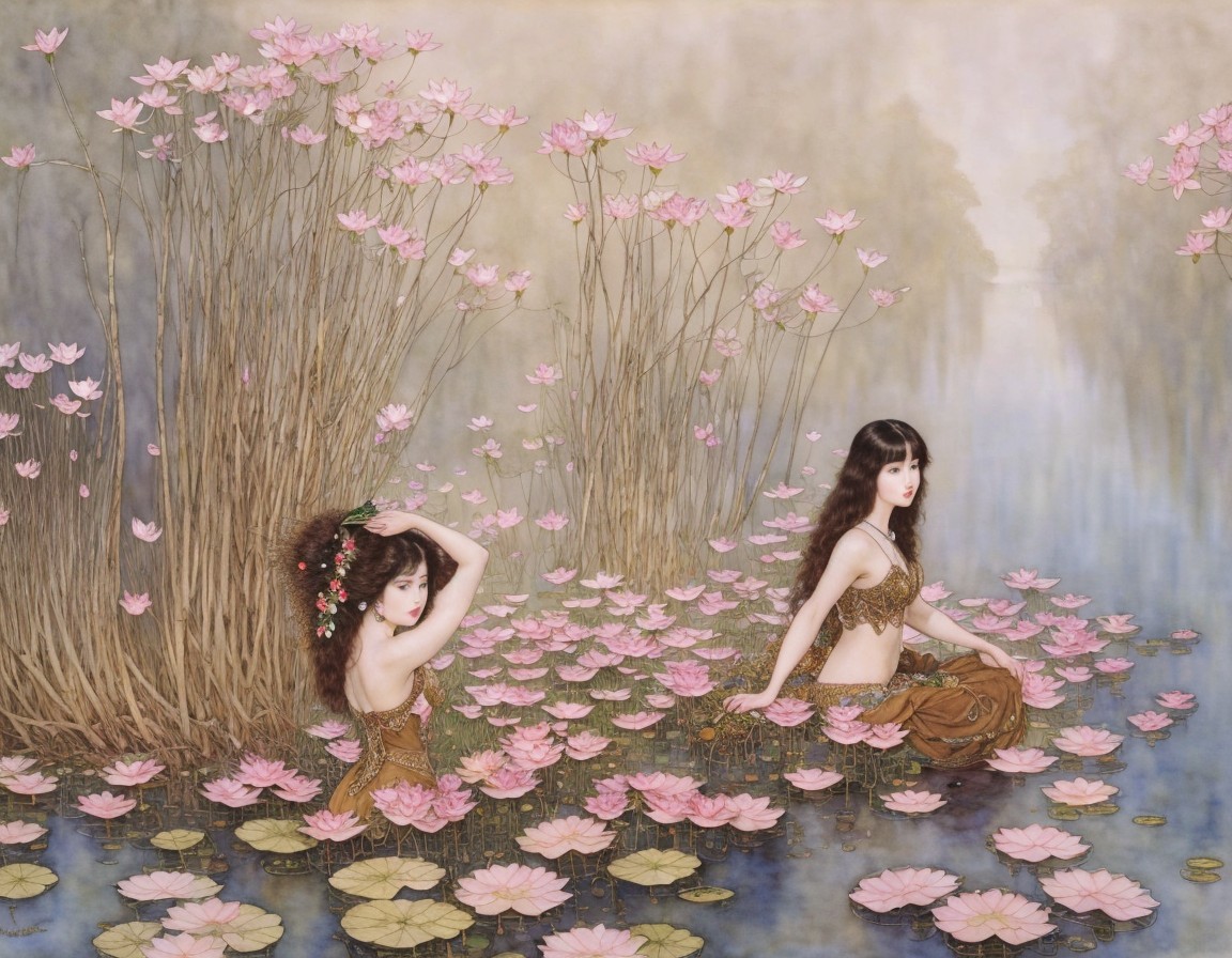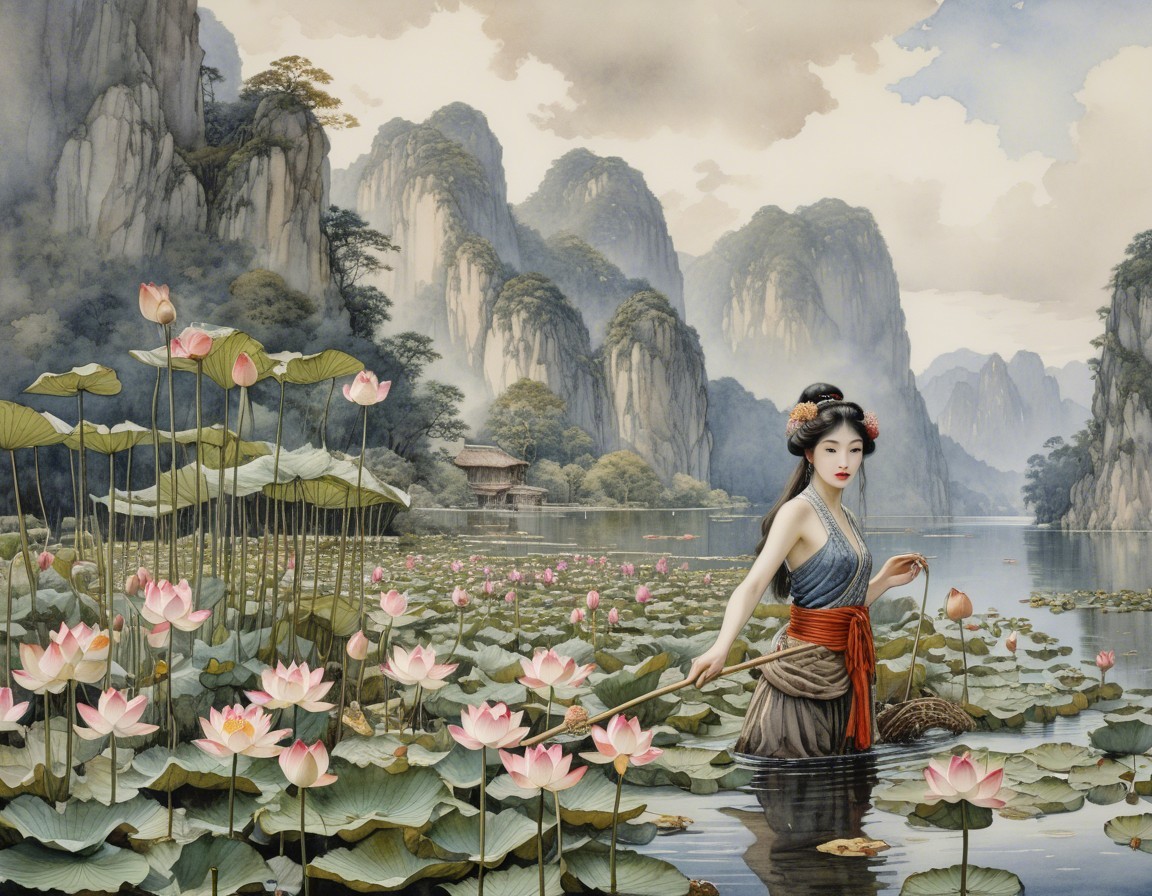 A serene painting of a woman collecting lotus flowers in a tranquil pond, surrounded by lush foliage and a distant boat.
