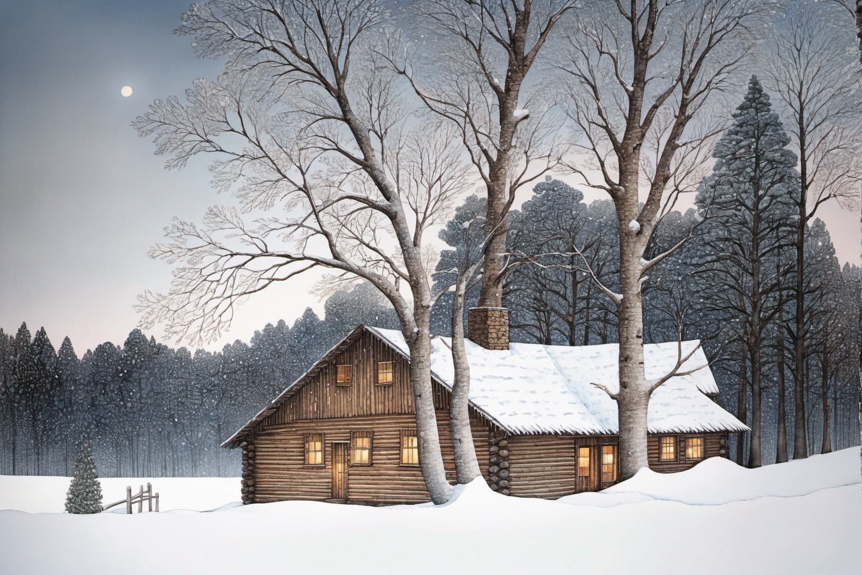 A cozy snow-covered cabin amidst wintry trees under a twilight sky. A serene, picturesque winter landscape.