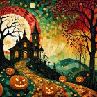 A whimsical Halloween scene featuring a grinning, cloaked character standing on a cobblestone path. Haunted houses, glowing pumpkins, and bats surround a large, eerie moon.