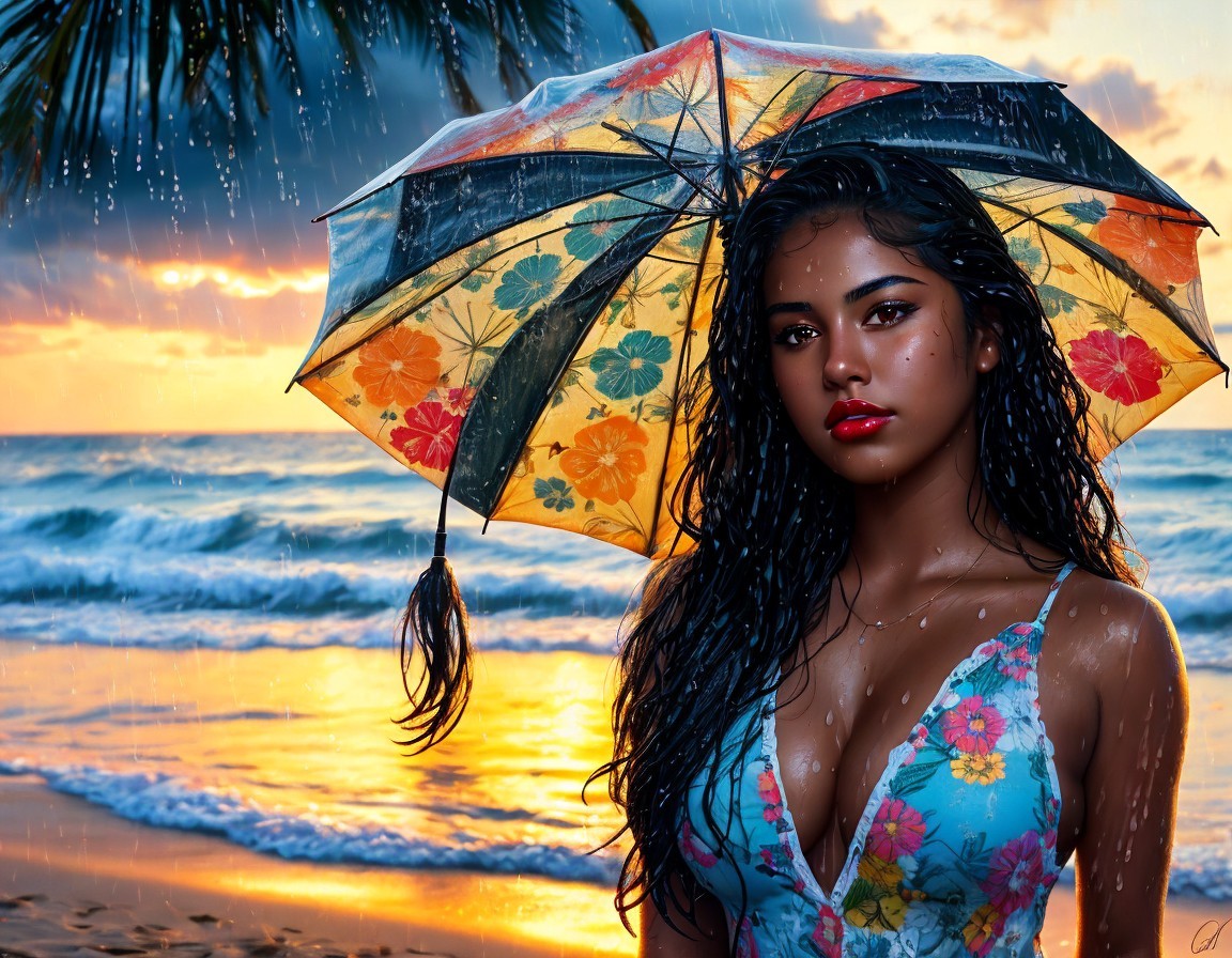 A woman under a colorful umbrella on the beach at sunset, with waves in the background and water droplets visible.