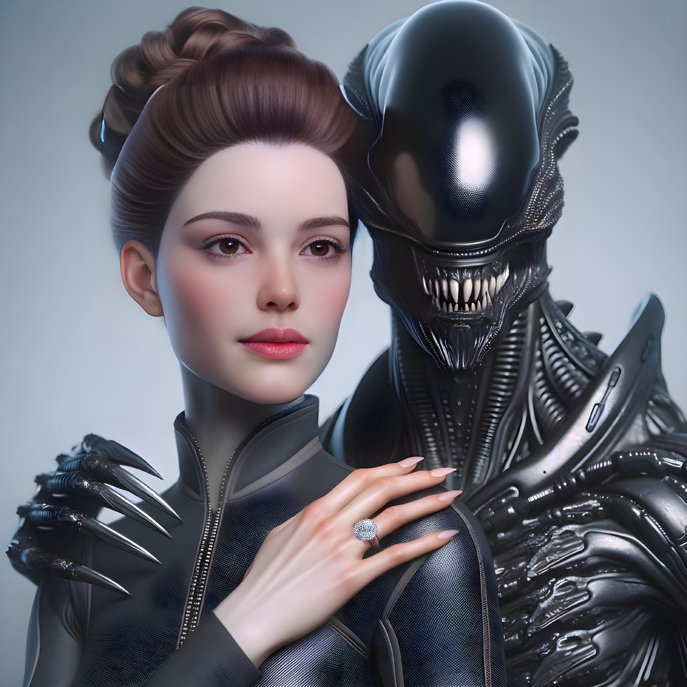 A smiling woman poses closely with an Alien creature from the iconic sci-fi franchise, showcasing a surreal blend of human and extraterrestrial.