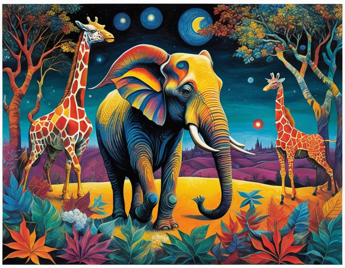 A surreal scene of an elephant and two giraffes bathed in vivid colors under a starry night sky. Surrounded by oversized, colorful leaves, the animals stand on a hill overlooking a distant village. The artwork fuses fantasy with nature, creating a dreamlike, magical atmosphere.