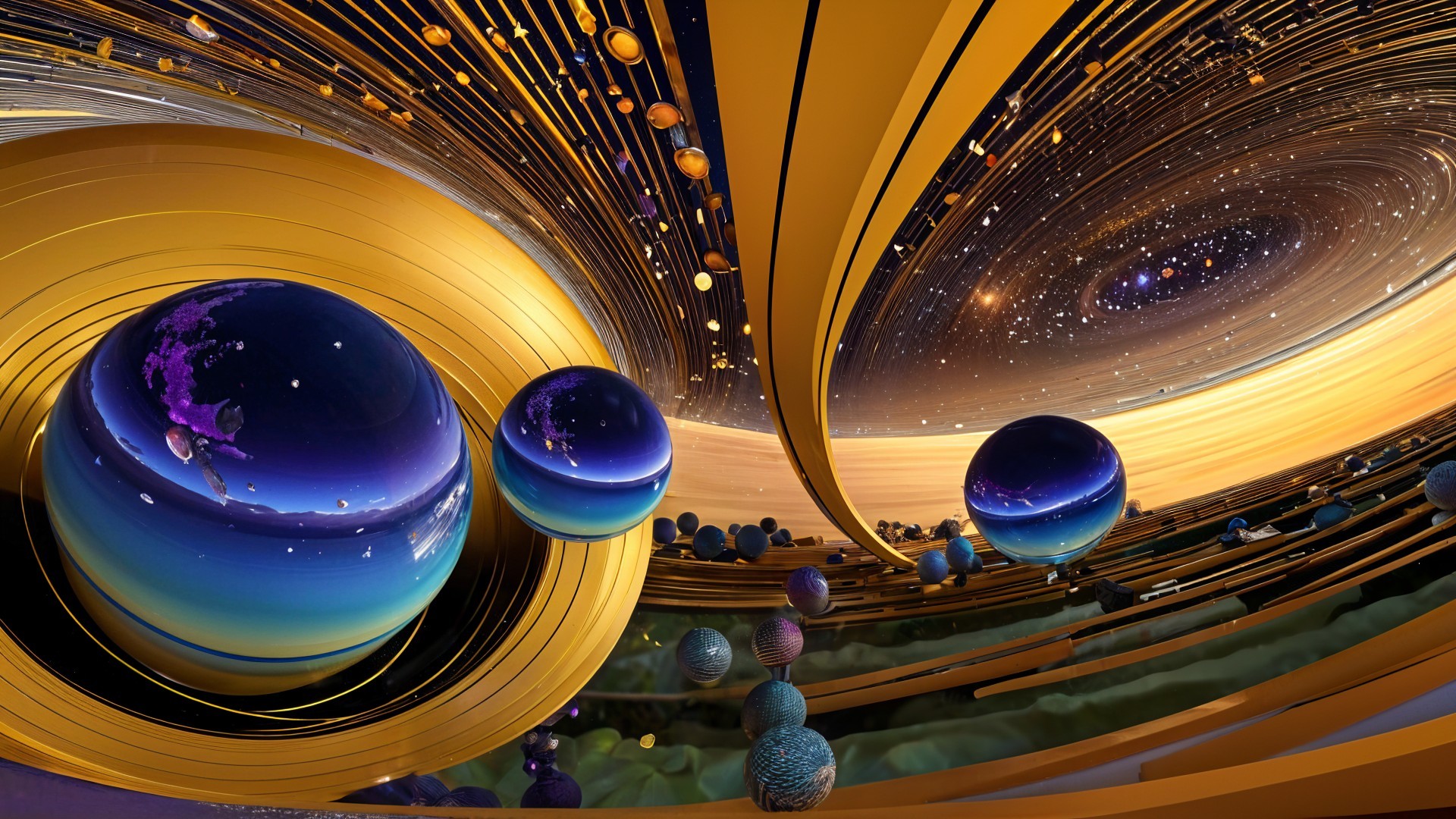 A surreal cosmic landscape features colorful planets and glowing golden rings amidst rocky terrain, set against a starry backdrop with distant galaxies and ethereal light.