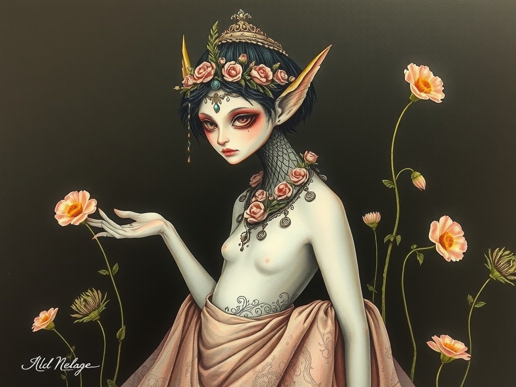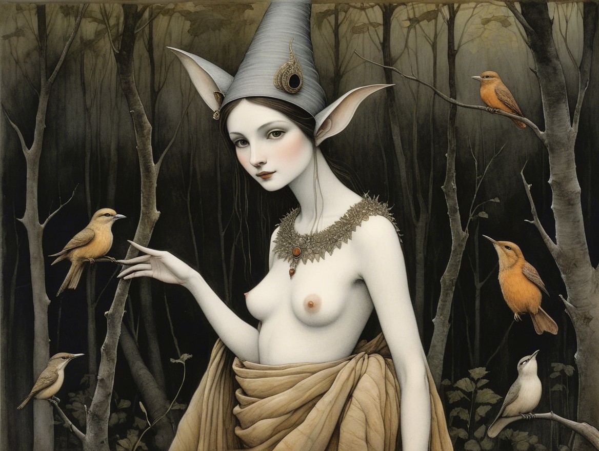 A mystical female figure with large horns stands in a forest, surrounded by birds, exuding an ethereal and serene aura.