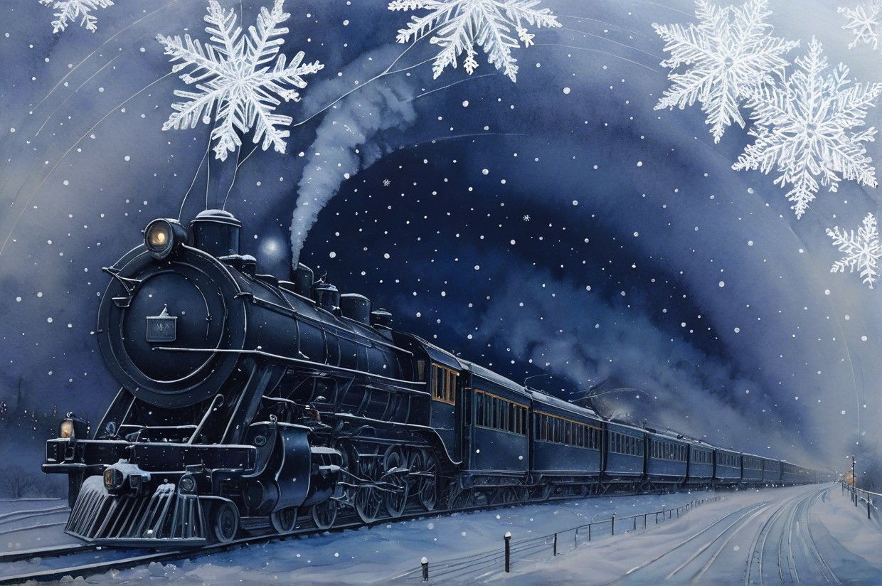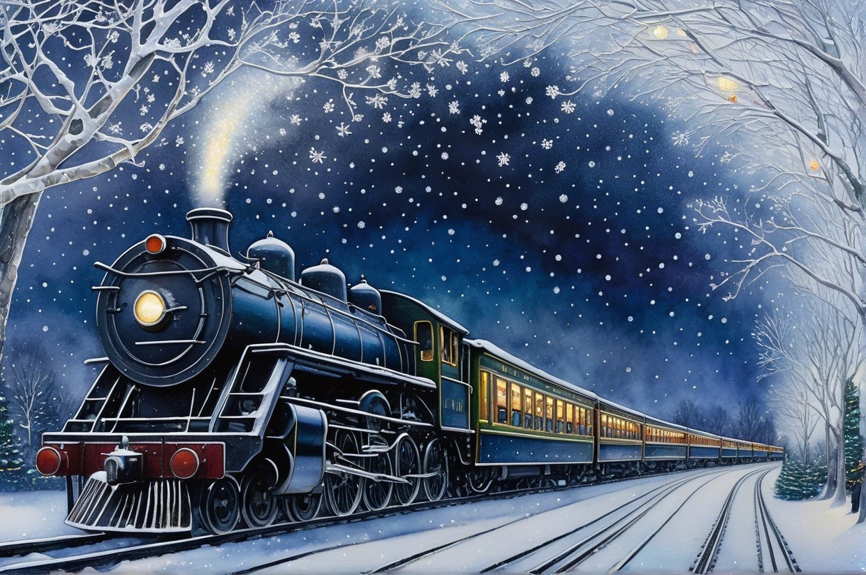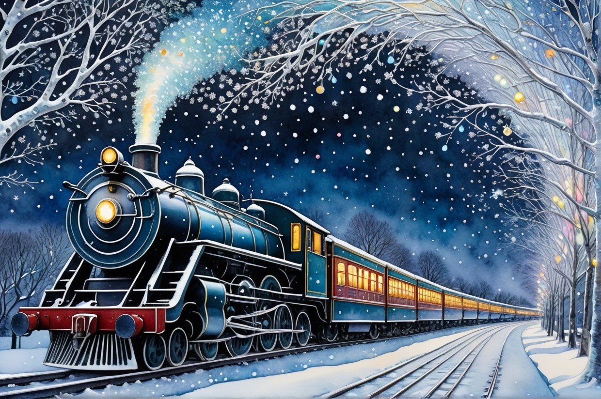 Intricately detailed etched salt frosted iced watercolor ink painting of highly imaginative swirling curving spiralling branching fibonacci jack frost winter wonderland, little fluffy birds covered in snowflakes, strings of a multitude of colored christmas lights decorating little birds, puffs of musical notes, multitude of colored christmas lights along train tracks, multitude of colored christmas lights reflecting in the snow, multitude of colored christmas lights on branches of trees, colored intricately shaped crystal sparkling snowflakes, frosted sparkling forest, mountains, ice, spiralling branching floral-like plants, cosmos, galaxies, northern lights, arthur rackham, van gogh, monet, maxfield parrish