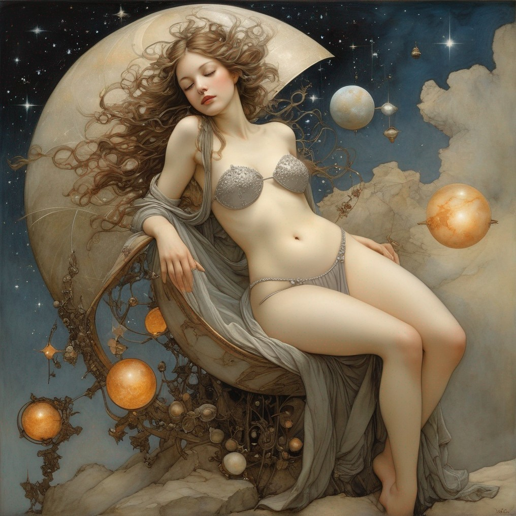 An ethereal artwork of a woman resting against a moon backdrop with stars and planets, featuring flowing hair and drapery.