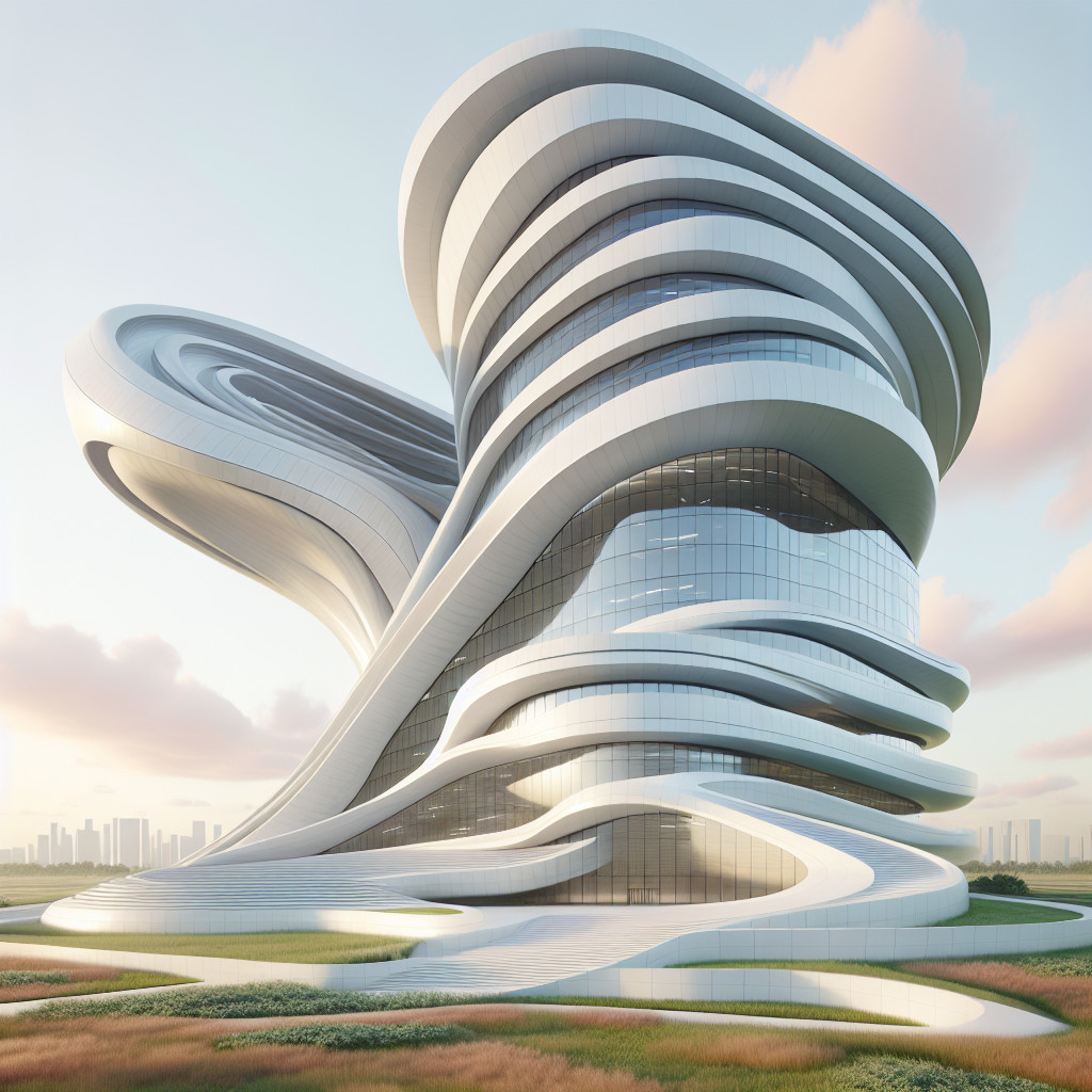 The image showcases a modern, twisting white tower with large windows set in a lush green landscape. Its unique design features organic shapes, contrasting with the urban skyline in the background.