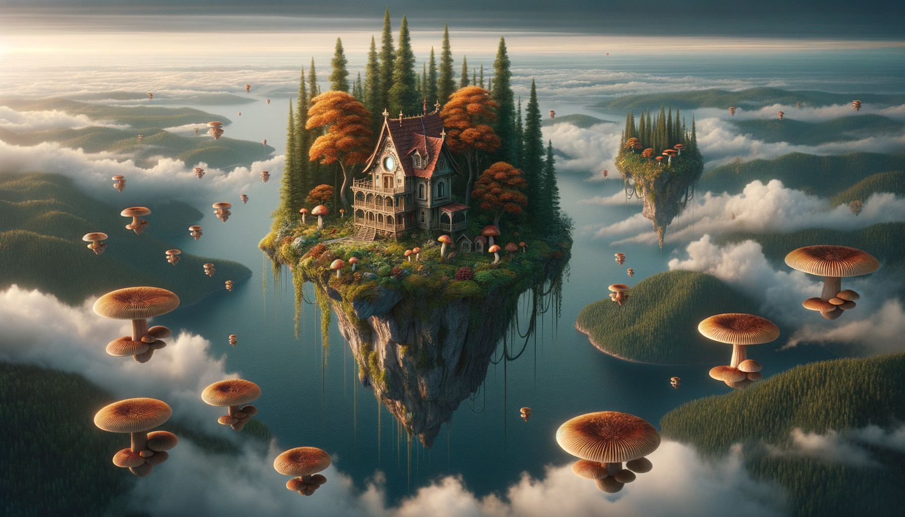 Tiny fantasystyle house on a small flying island high in the sky over the ocean, wilderness with trees and toast mushrooms