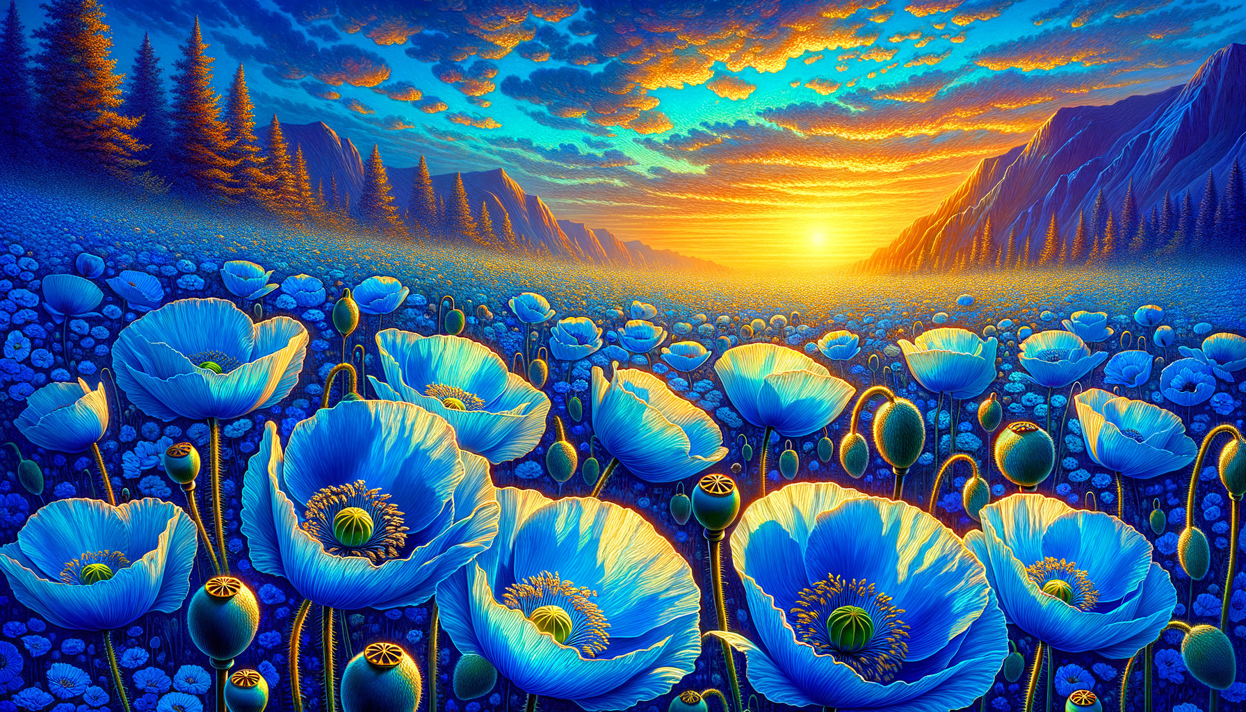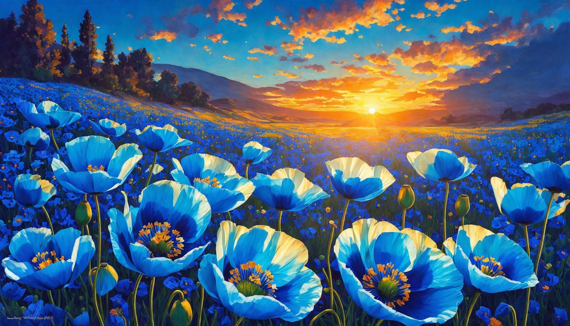 A vibrant painting of a sunset with blue poppies in the foreground and a colorful sky.