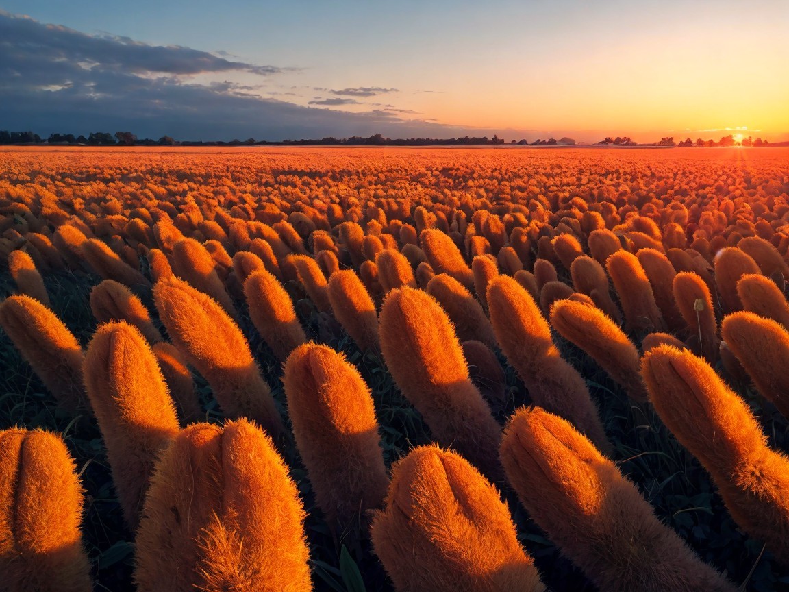 Surreal Pumpkin Field at Sunset with Emerging Feet