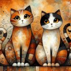 This vibrant artwork features two cheerful cats: one orange with stripes and one black and white, both adorned with colorful patterns. They sit side by side against a lively floral background.