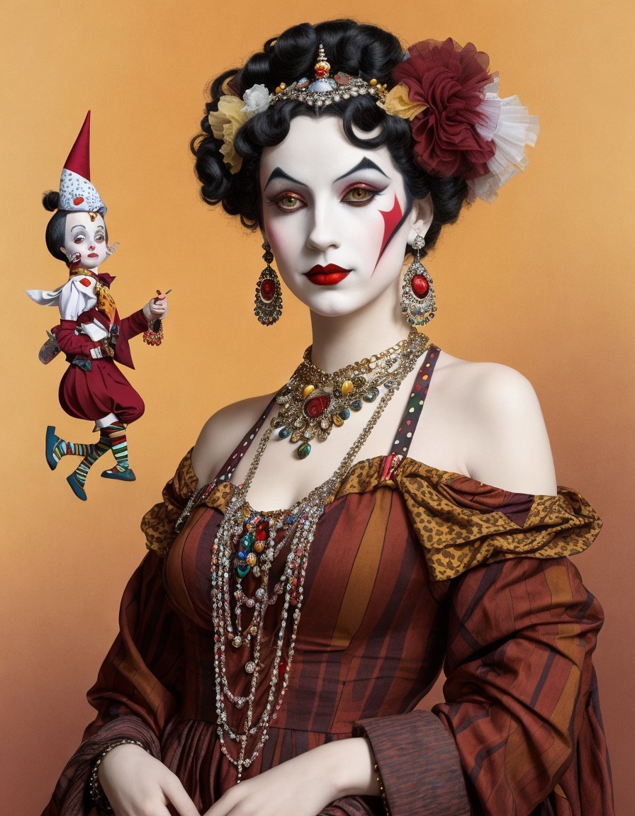 A painting of a woman in vintage attire with clown-like makeup, accompanied by a stylized bird on a branch.