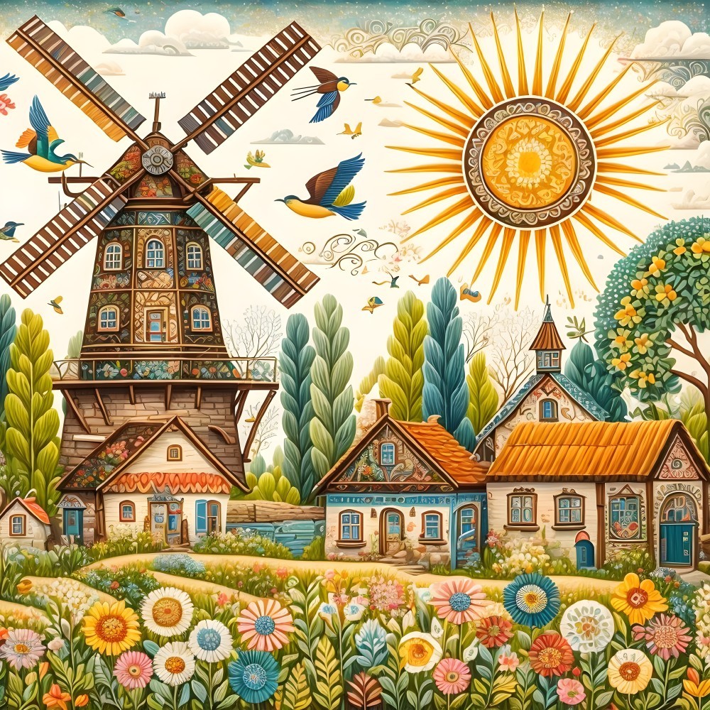Vibrant illustration of a pastoral scene with a windmill, cottages, diverse flora, and birds under a radiant sun.