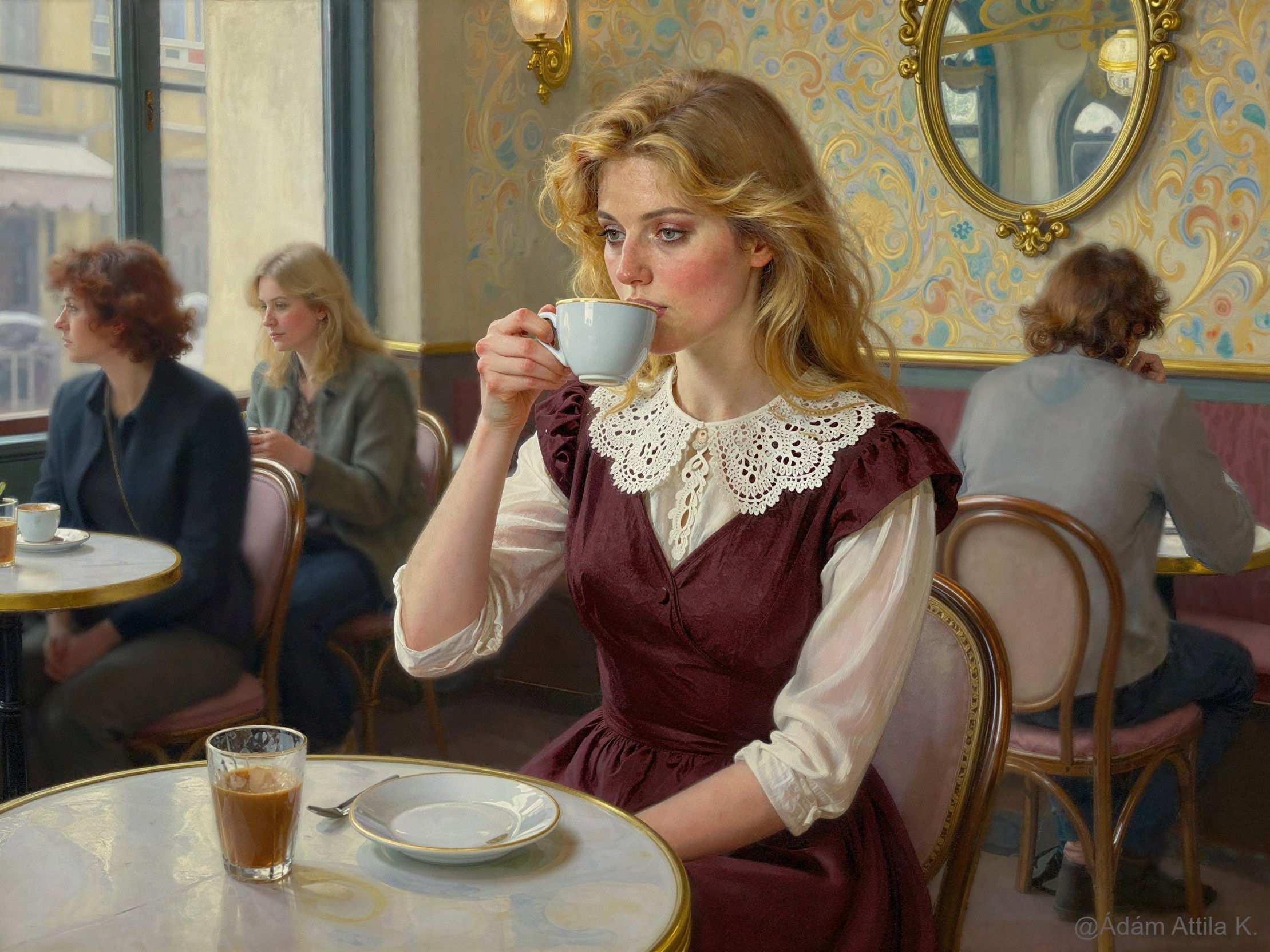 A young, blonde woman in a 19th-century style burgundy dress with a white lace collar and white sleeves sits in a cafe, sipping from a white teacup with a gold rim. Her blonde hair is loosely curled around her shoulders, and her face is a flushed pink.