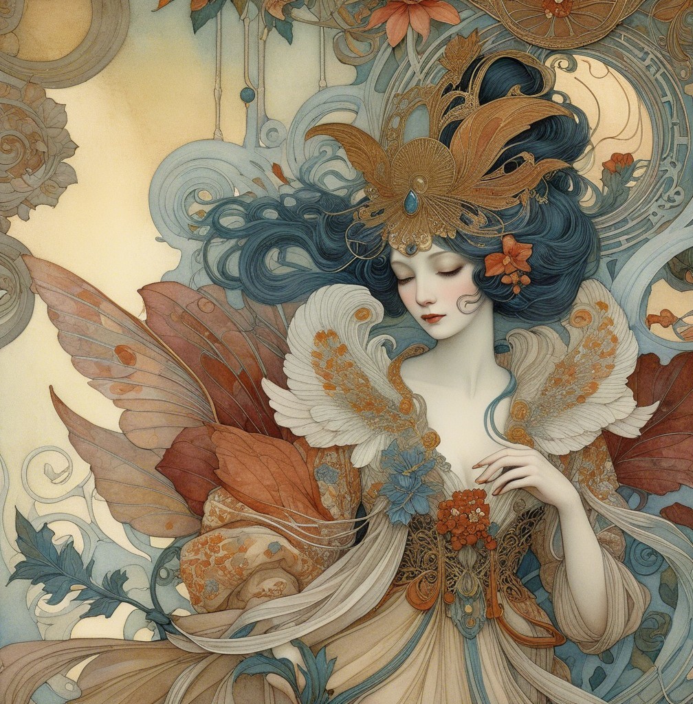 A serene woman adorned with butterflies and flowing hair, she wears an intricately designed gown. Delicate floral motifs surround her, creating a mystical and ethereal atmosphere.