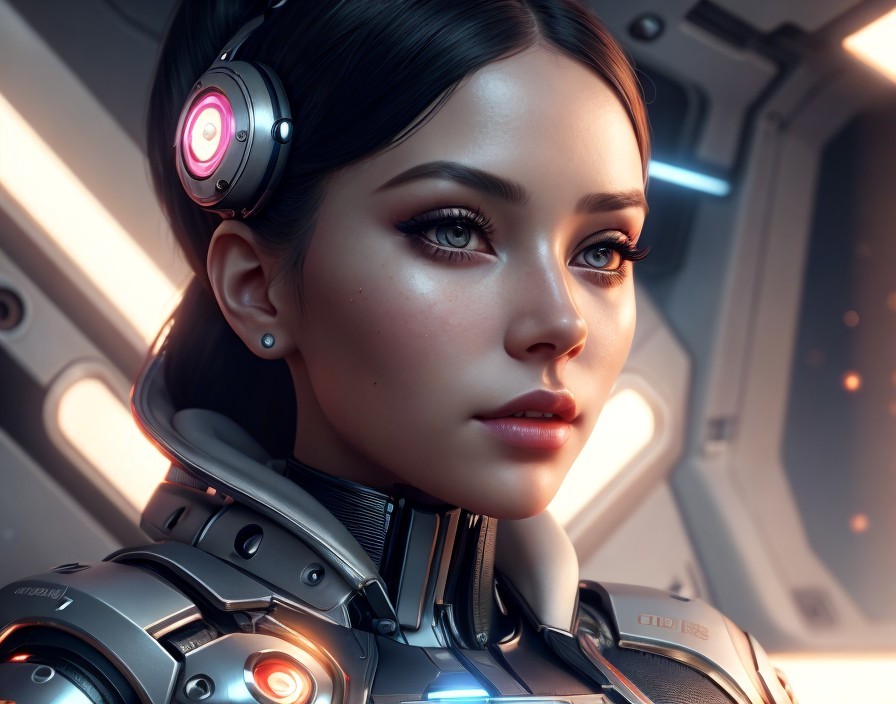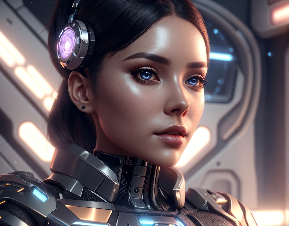 A digital artwork of a female cyborg with a mechanical arm, futuristic armor, and illuminated accents in a sci-fi setting.