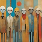 The image features a group of surreal, elongated figures with large, expressive eyes, arranged in a vertical composition. Their muted colors and abstract backgrounds evoke a sense of mystery and loneliness
