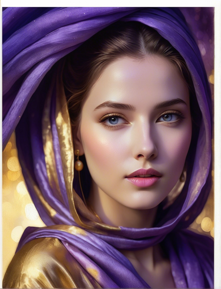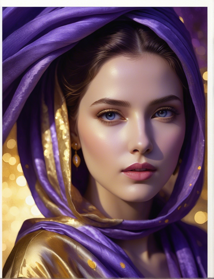 Prompt: In the enchanting bluish twilight, a female portrait emerges, draped in luxurious golden and purple textured dresses, avant-garde with 3d effects, layered shapes, UHD, HDR, negative lucas numbers, raytraced shadows 1.4, watercolor, indiecore details with glowing particles, visible fibre textures, texture mapping 1.3, sfumato, stylized fissured hues in a plique-à-jour technique, stylized, aquarelle extrusion, wet on wet watercolor by Jean Haines and Coby Whitmore, embodiment by Ho Baron, only curves, stylization 1.8 exuding an eldritch atmosphere, inspired by Yayoi Kusama, acrylic ink and chalk to create vibrant and intricate details, surreal ambiance. Juminocore reminiscence. The artwork is characterized by layered paint overspray for enhancing the warm gradient colors and small reflections, plasticity 1.3, soft brushed texture, golden and pastel harmony, estranged dreamy movement, painterly detailtriadic color scheme lilac beige yellow. Drawing inspiration from the styles of Lawrence Schwinger and Stan Lee & Cecilia Frigati and Esao Andrews, displacement mapping 1.3, visible textures, shadow mapping 1.3, mip-mapping 1.3, phong shading 1.3, mesmerizing fusion of vine and oiled charcoal textures, compressed charcoal, black outlines, black conte crayon, rich tapestry of textures. Streamline_moderne influence, Reduction, simplicity, perpendicular line-art features, cream wove paper, transformed into a golden hue, adorned with golden oil pastels and pigments, adding depth and luminosity, mip-mapping, masterpiece of highly detailed sharp focus, exuding elegance and a touch of posh fantasy. The cinematic lighting, visual narrative. Parallax occlusion 1.8. Mysterious gothic fantasy, textured watercolor illustration influenced by Gustav Klimt, Man Ray, and Alex Grey, raytraced shadows, dyed effects, depth of field, bokeh, and debeh,cracked paper texture, clammy, blottied visible textures, sticky, angled, sultry, steamy, humid, moist, warm tones, stylized with a touch of whimsical watercolor and ink. Dynamic and dreamlike composition with layered textures, bold lines, and exaggerated shapes. Visible brushstrokes, soft edges, ethereal purple glow, featuring a hauntingly detailed Victorian gown, intricate asymmetrical line art in a zentangle style mix, with a color palette of light grey, dark beige, and rosewood-pink, embellished with crackles, contraptions, nacre, beads, and flecks, set in colorful spheres and swirling shapes, with a blend of rigid and fluid, impossible light transitions, highliridescent and warped beautiful coloring, dynamic, and alluring, evocative. Inspiration from the artistic influences of Ho Baron,abd Odilon Redon, textures by Jackson Guice, Anne Bachelier's textured whimsical style. Employing soft pastel painting techniques, the portrait transcends traditional boundaries, flabbergasting geometrical stylization 1.8, cracked paper texture, small brushstrokes with defined edges, tiny and lean lines, orphism, abstracted, tesselated, micro-level intricacy, large-scale complexity, colorful line-art by William Bradley, suppleness, flexibility, softness, pliability, malleability, litheness, flowing line-art by William Bradley, hues by Ho Baron and Ed Binkley, high definition cinematic postprocessing beautiful award winning hyperrealistic, ultra detailed, crisp contrasts