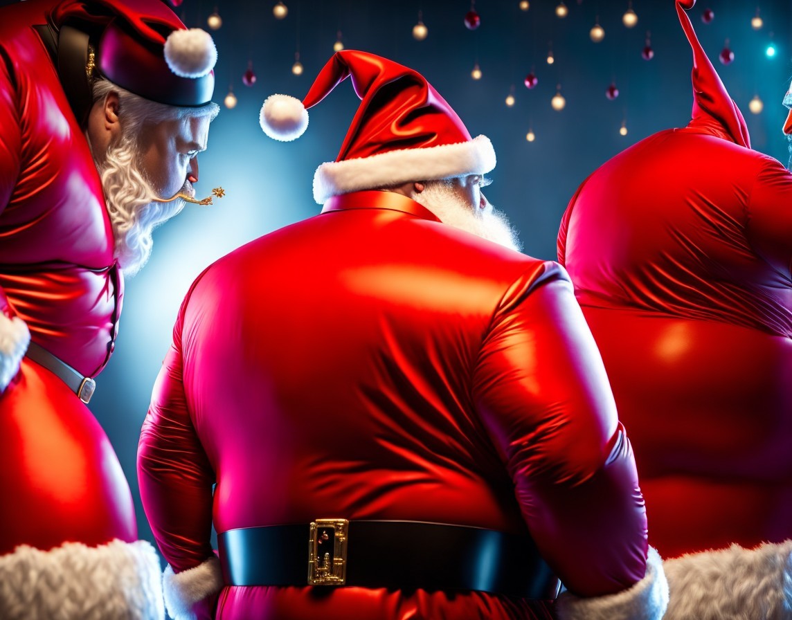 Three individuals dressed as Santa Claus are depicted from behind, showcasing their red suits and iconic hats against a blue backdrop.