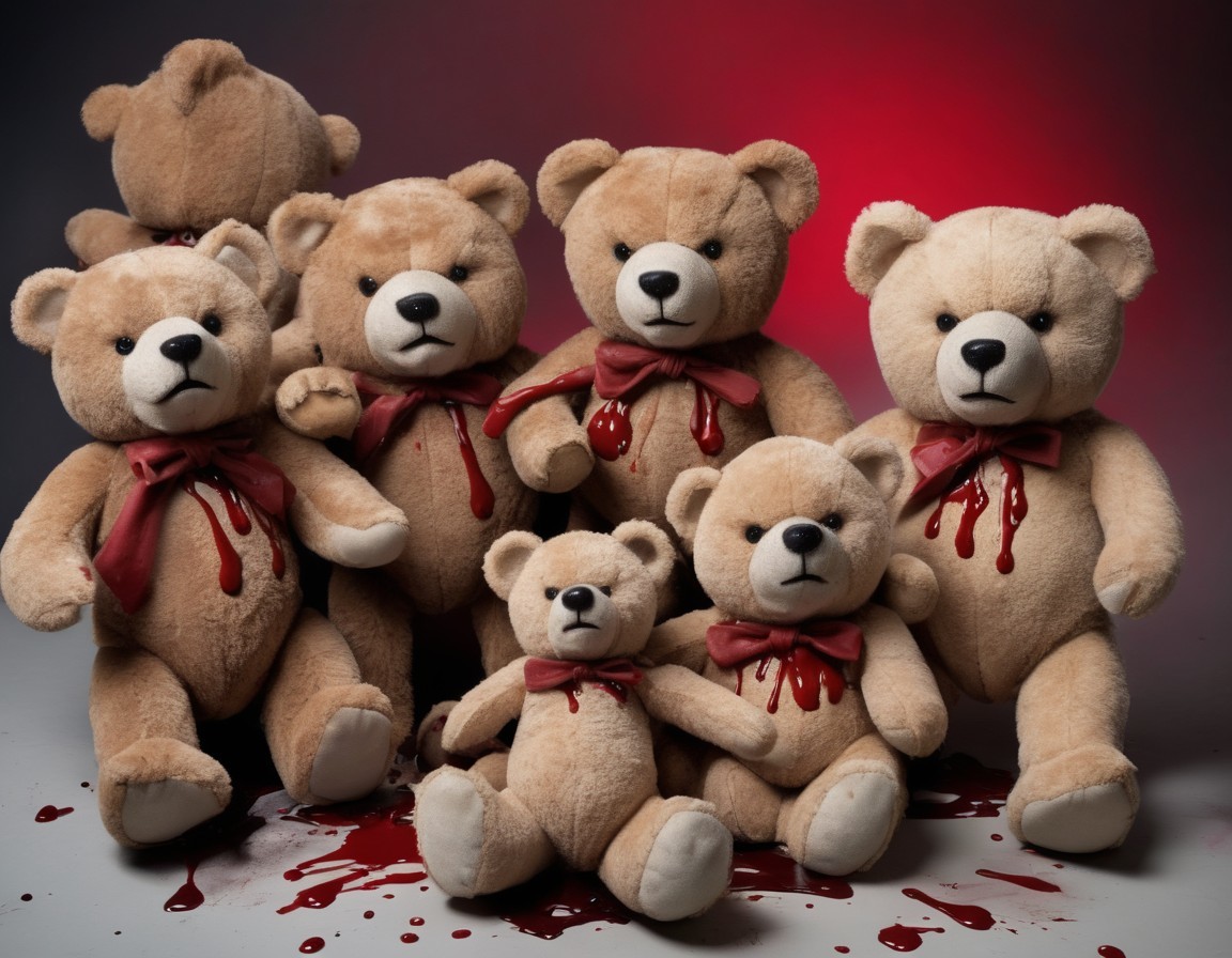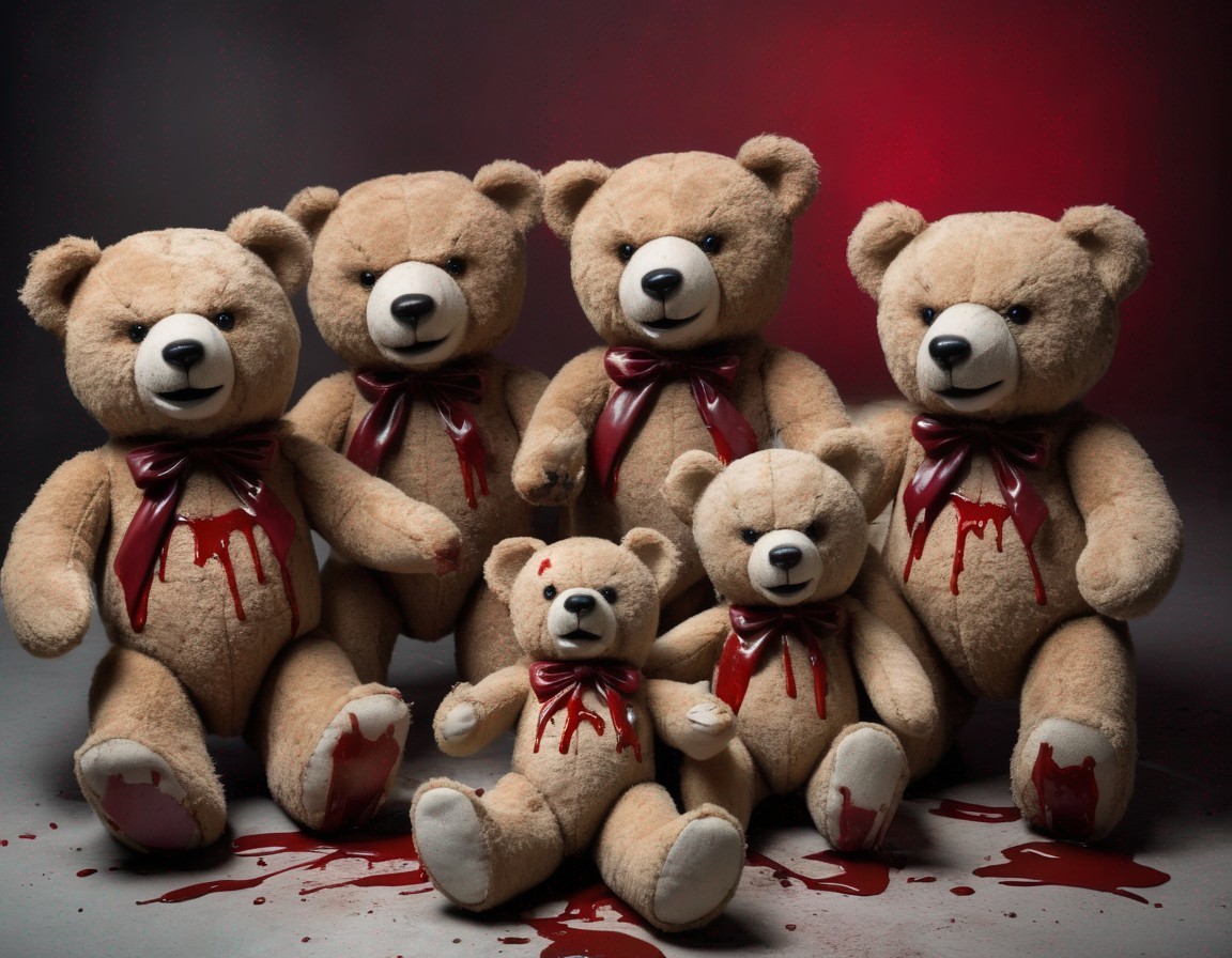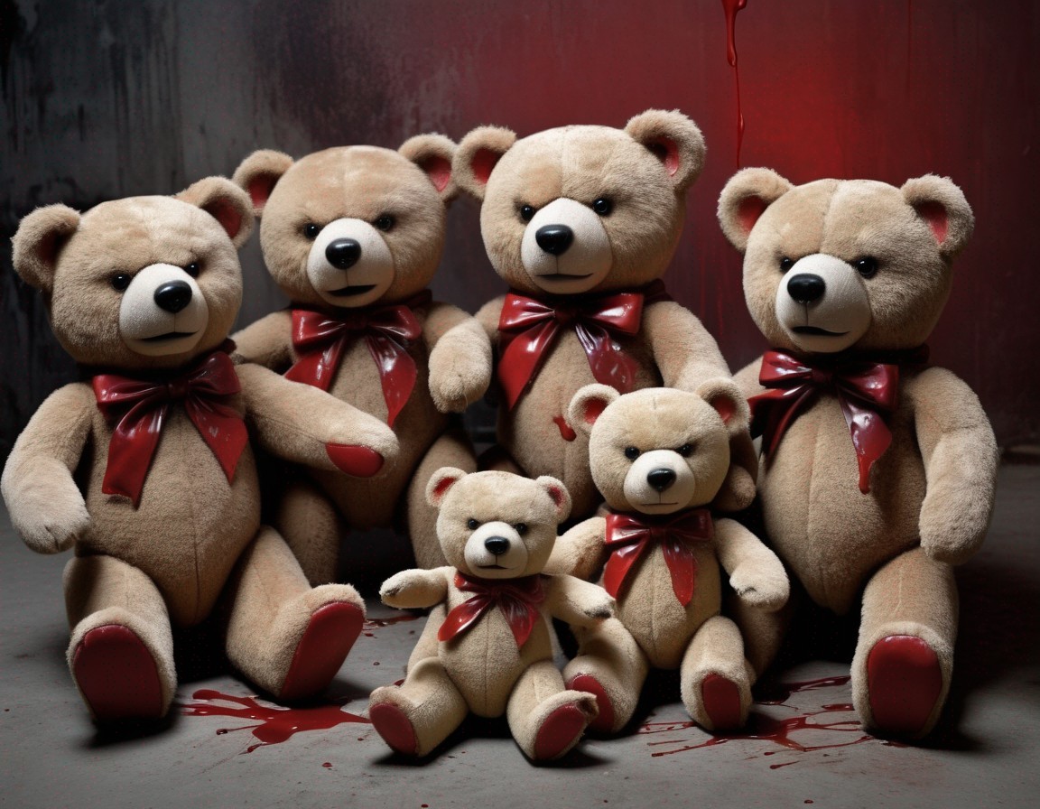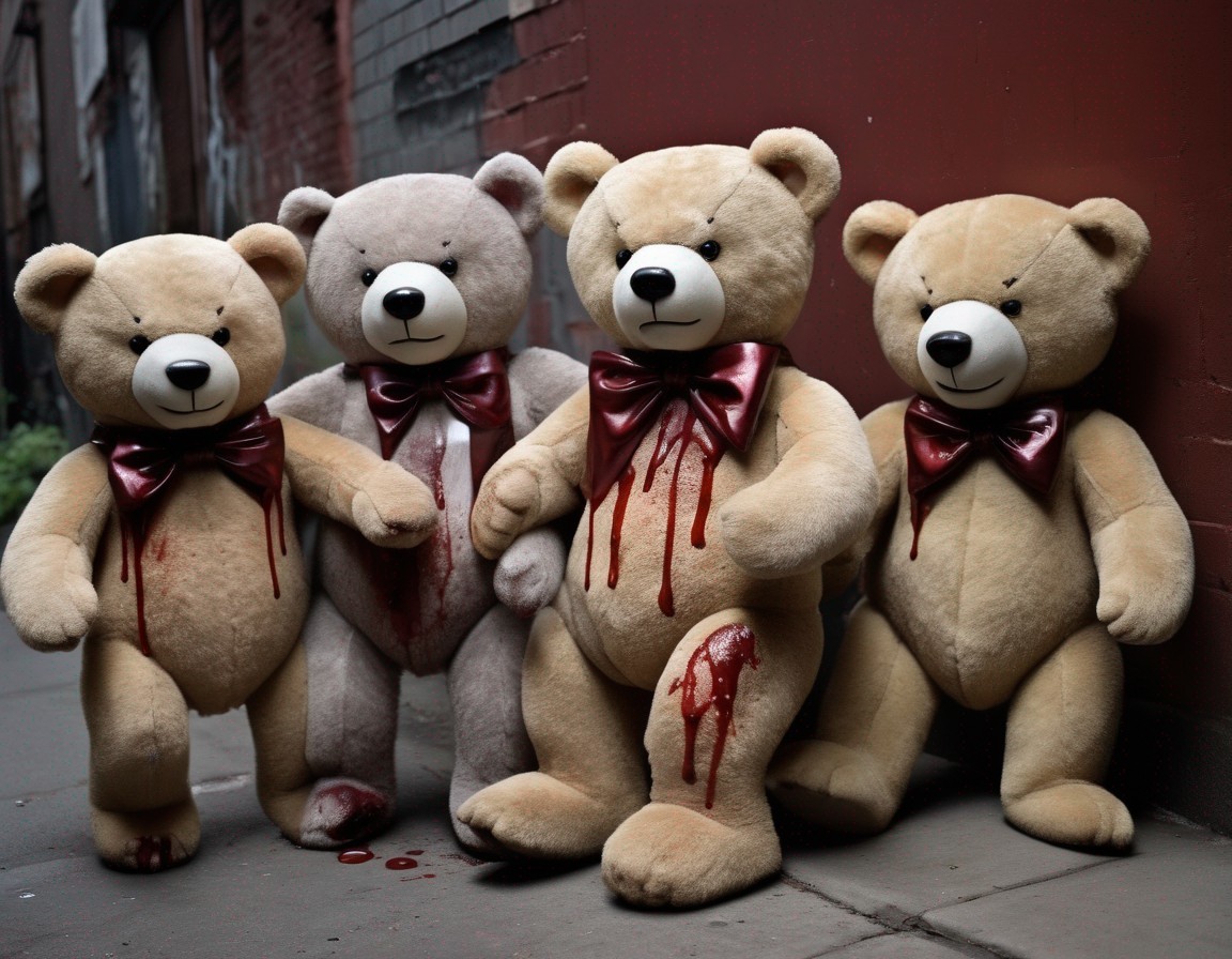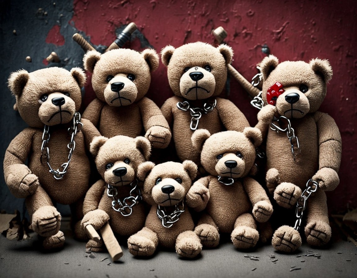 A group of fierce-looking teady bears, armed with various weapons, posing aggressively in a dimly-lit, grungy environment.